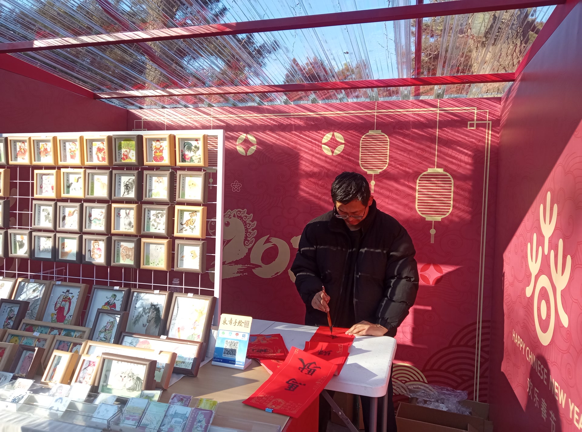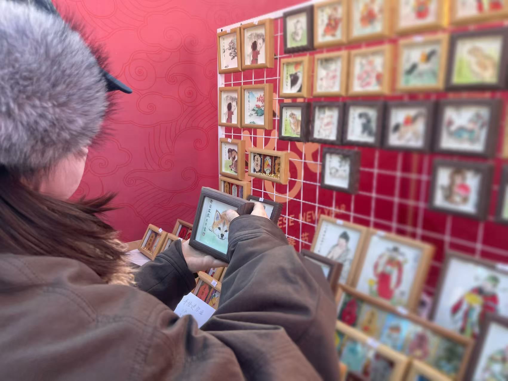 一幅巴掌大小的作品,精心创作至少需要一个小时。开摊第一天,游客驻足观赏者多、下单购买者少。赵东青不善吆喝,许多人并不知道这些小画是纯手绘而成。第二天,他便在摊位上支起小桌,现场提笔创作,用一笔一画吸引路人目光。“市集将持续到三月初,今年春节,我就打算在摊位上过了。”
