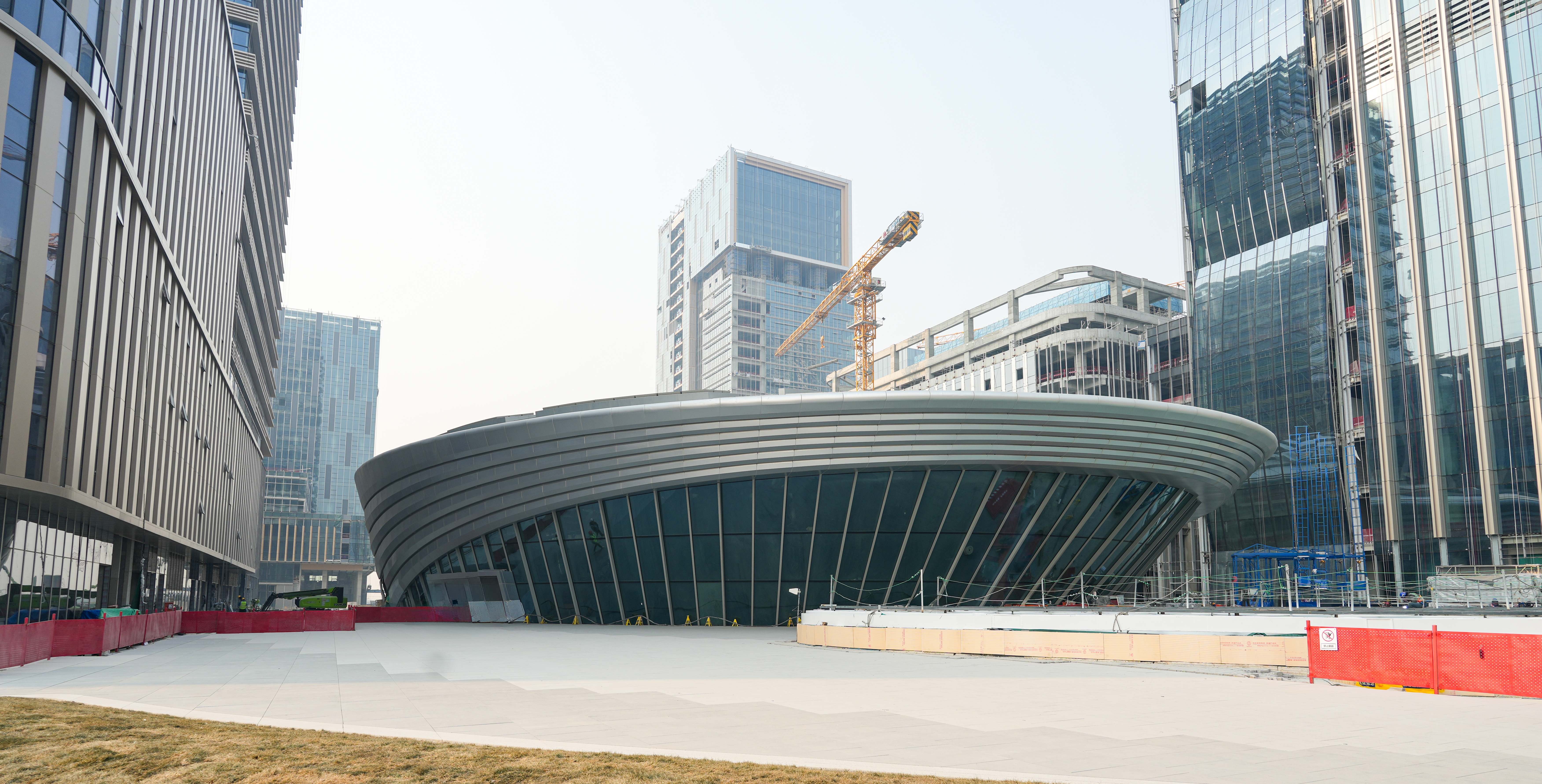 在京雄快线的起点站雄安航站楼站,地下三层的站厅层内灯火通明,施工正紧,工人们在紧张进行铝板封包与吊顶安装,金属碰撞声清脆作响。