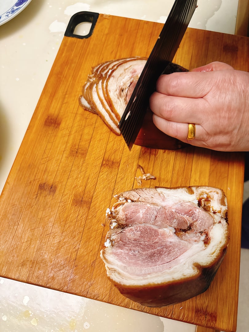 “一开始我也不会做,直到我父亲年纪大了味觉减退,我才接棒。”李惠兰说,父亲放料更多,把肉的香味盖过了,她就一点点儿改良。做到后来,每年春节时亲朋好友都馋这口肘子。李惠兰每年都要备好五十斤肘子,从腊月二十一直做到腊月二十六。除了留五斤吃,其他都作为年货送人。