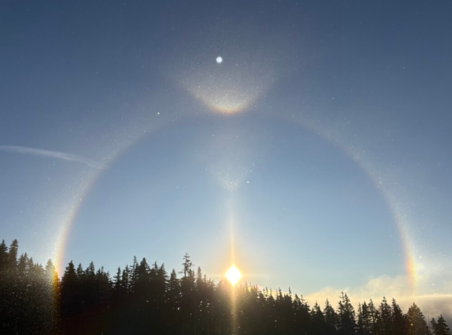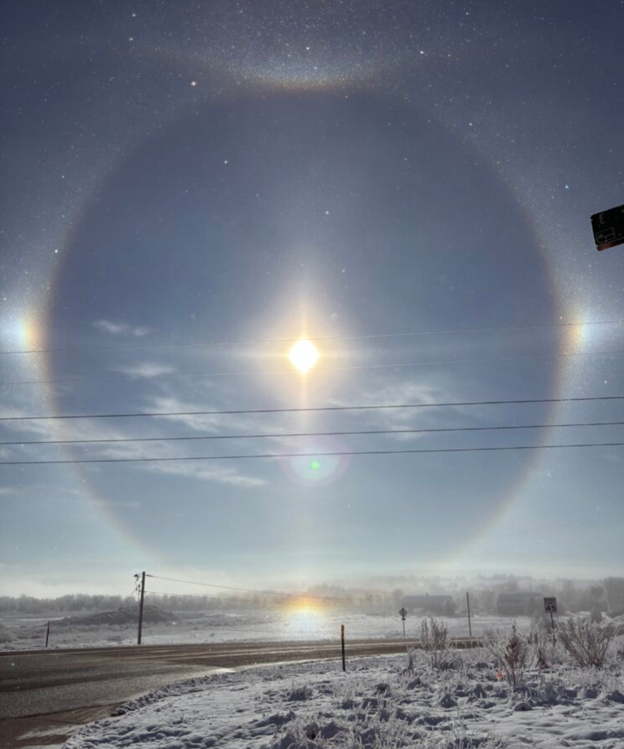 记者在一个名为Cloud Appreciation Society(赏云协会)的全球云彩爱好者社区中看到,不少网友上传了自己拍摄到的幻日和幻月照片,太阳或月亮在中间,四周有一圈光晕,就像是一个巨大的戒指环绕着太阳或月亮,同时在戒指两侧有两个非常明亮的光点,这两个光点就像两个太阳或月亮一样,但它们不是太阳或月亮,只是虚像。