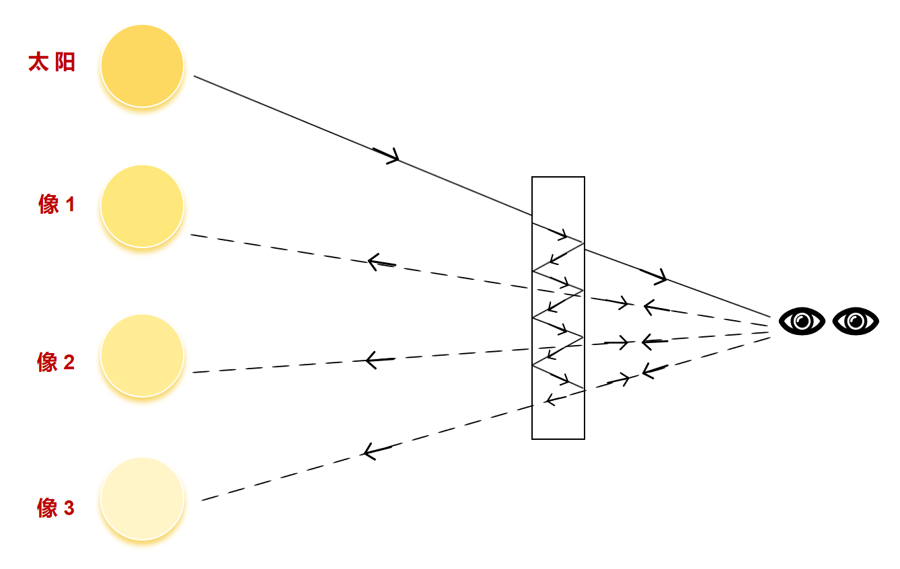 当太阳光透过双层玻璃时,首先会在玻璃中形成折射光,折射后的光路会发生一些偏转,此时折射光进入眼睛,使眼睛能够看到太阳的位置。与此同时,进入玻璃中的折射光还会在双层玻璃中经历若干次反射,每次反射后的光线会再次透过双层玻璃进入眼睛,然后“映在”玻璃上,最终形成若干个像,也就是肉眼看到的几个连续的太阳或月亮。一般透过双层玻璃看到的几个太阳或月亮都是等距离排列,而且随着反射光的减弱,成像的亮度也会一个比一个暗。因此,这不是罕见的天文现象,只是普通的光学现象。