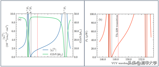 左:钍-229同质异能态跃迁附近非线性极化率和相位匹配函数 右:钍-229同质异能态跃迁附近真空紫外激光输出功率