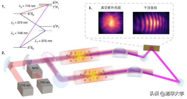 图1:镉原子共振增强四波混频过程 图2:实验示意图 图3:相机拍摄到的真空紫外光斑和干涉条纹