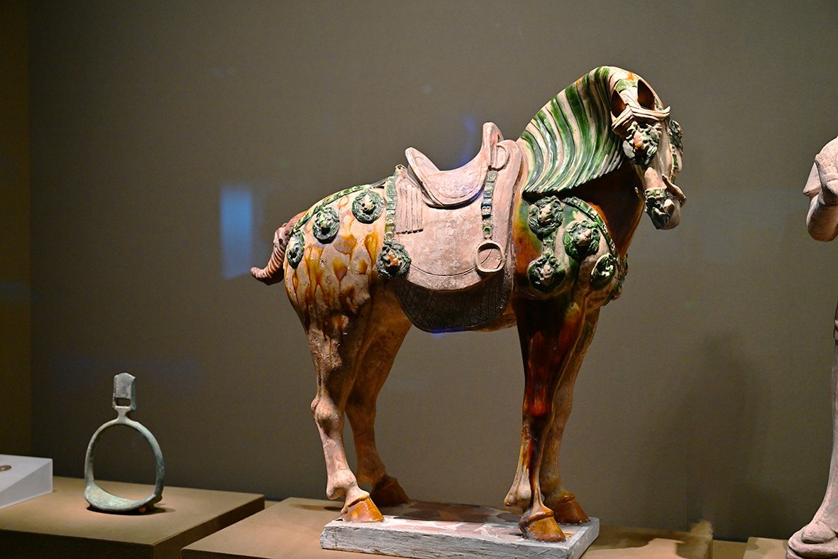 三彩陶马通体以赭黄为底,釉色自然流淌,在马身上晕染出深浅不一的褐红,宛如骏马天生的皮毛,细腻又富有光泽。它的鬃毛被“修剪”得整整齐齐,一缕缕鬃毛以翠绿釉料勾勒,间杂着底色,在灯光下熠熠生辉。陶马身披高桥鞍,头戴的络头和身上绑带、装饰皆透露着精美华丽,在绿釉点缀下尽显雍容华贵。