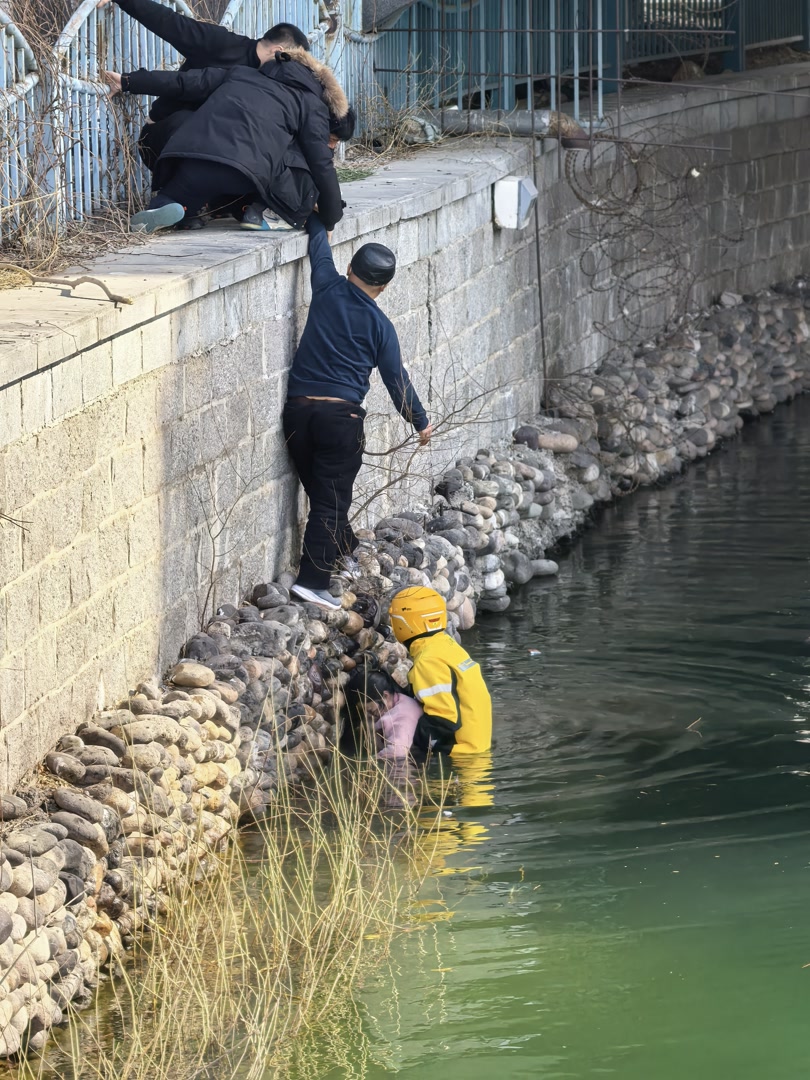 2月12日下午,北京西城冰窖口胡同附近一名女性落水,路过的一名外卖骑手跳进两米多深的河道,与爱心群众一起将落水者救上岸。