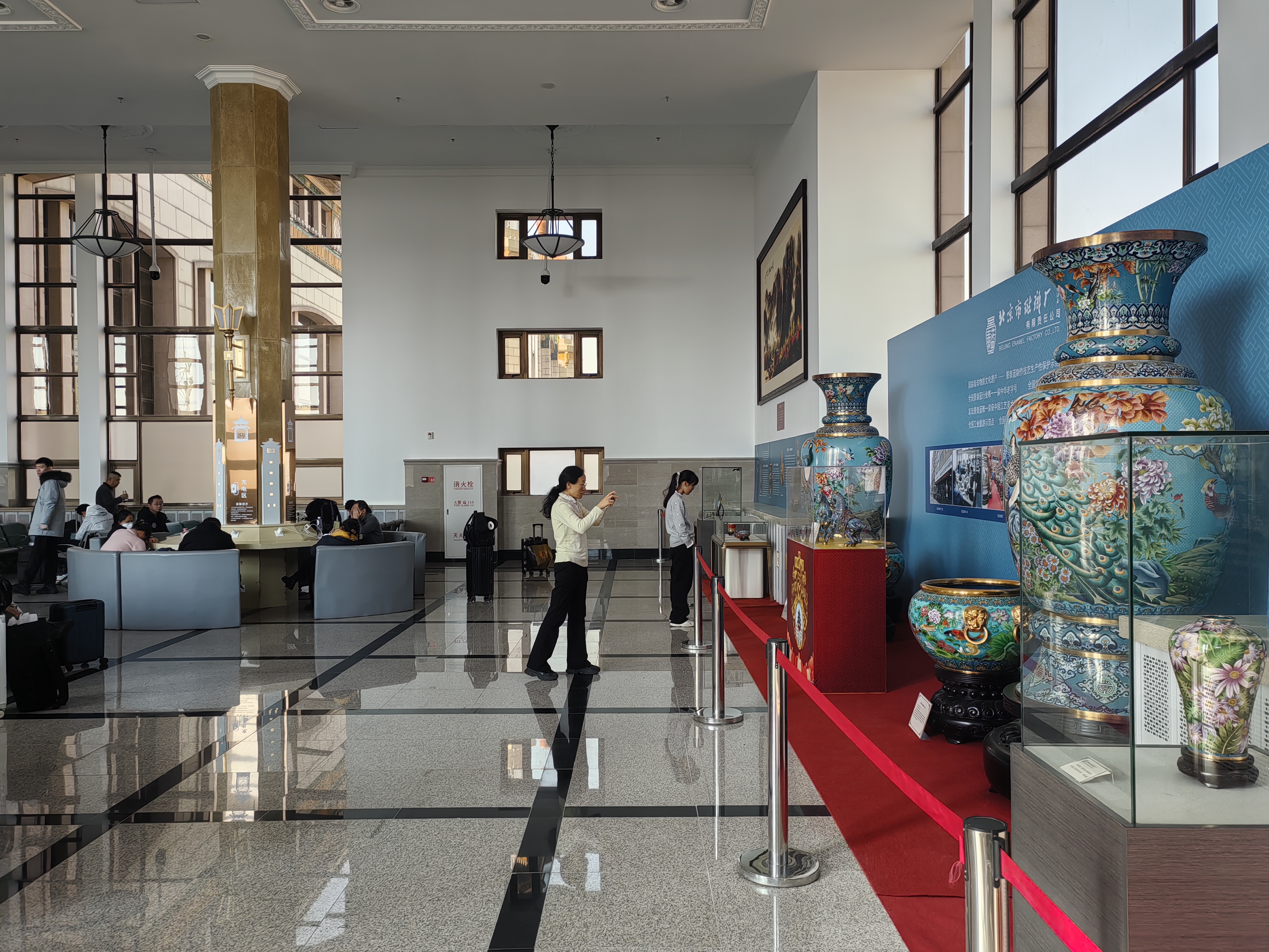 步入北京站候车厅,景泰蓝非遗展厅数十件精品错落陈列,勾勒出“燕京八绝”的璀璨风韵。展区内既有复刻明清宫廷风格的传统器型,承载六百年铜胎掐丝技艺;亦有融合生肖马年元素的作品,釉彩饱满、线条灵动,呼应新春团圆主题。曾作为国礼亮相国际舞台的赏瓶尤为瞩目,鎏金纹样与宝石蓝釉交相辉映,传递国泰民安之愿。