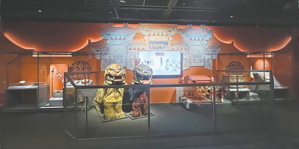 此单元以国家级非遗“妙峰山庙会”为重点,依托首博馆藏清代“妙峰山进香图轴”等珍贵文物进行场景复原。策展方巧妙地将图中蜿蜒的山道景致融入设计,参观者的视线随之一路延伸,仿佛亲历朝圣香客沿路逶迤前行的场景,沉浸式串联起文会茶棚、武会表演、百戏竞陈的浩大场面。其中“幡鼓齐动十三档”武会,更是民间花会艺术的精华所在。刚猛惊险的开路(耍钢叉)、威武灵动的舞狮、高耸入云的中幡、诙谐有趣的杠箱……这些绝技并非单纯的表演,而是民间智慧、力量与情感的奔放表达。展览依次再现十三档绝技,动态还原了清代北方最大的香会上人烟辐辏、车马喧阗的盛况。