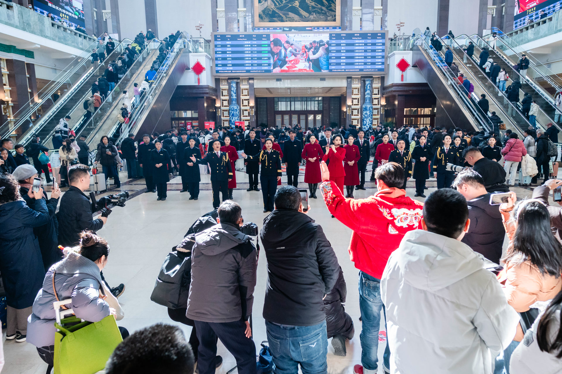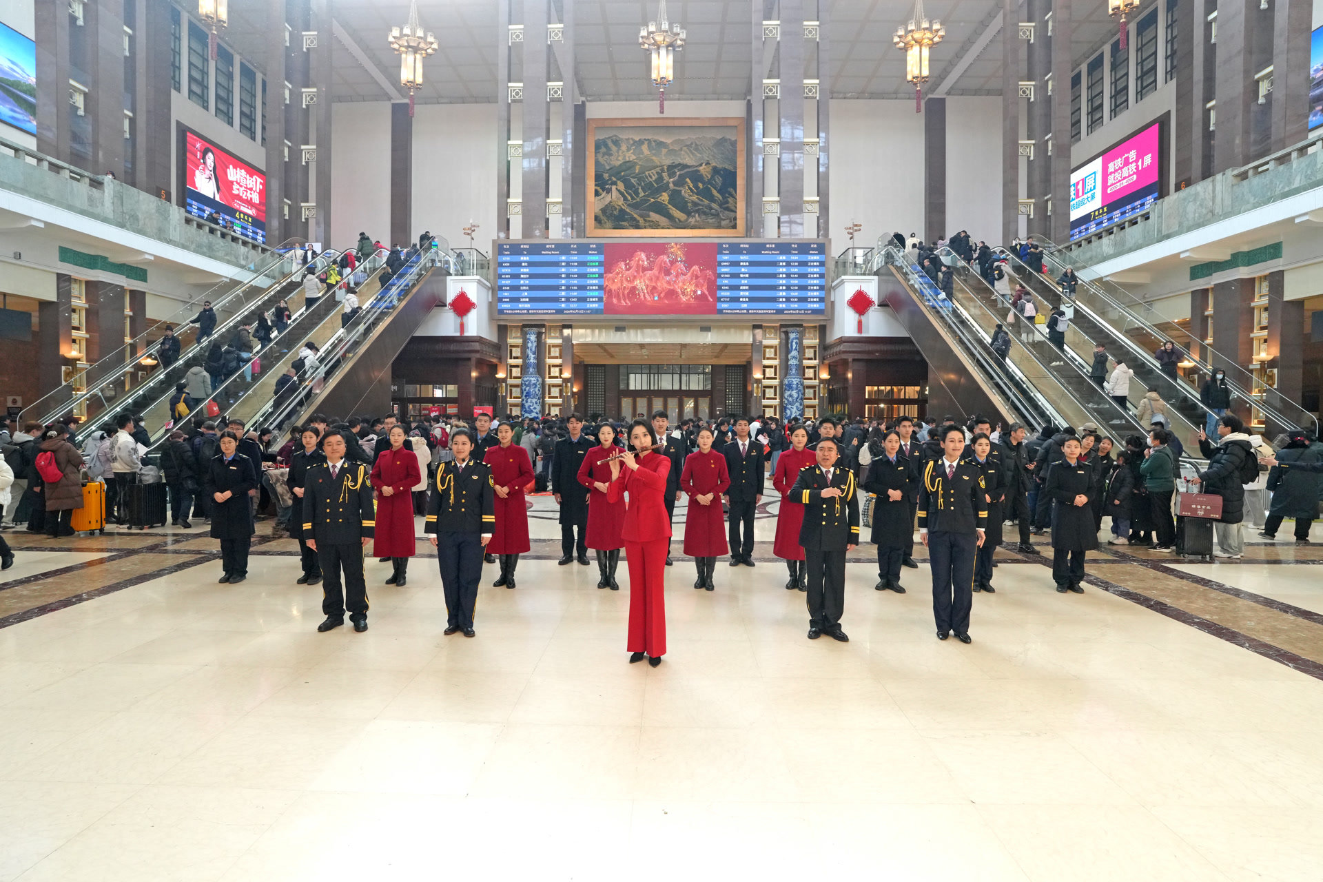 除了翰墨飘香,活动现场还洋溢着动人的旋律。国铁北京局的职工代表共同唱响歌曲《坐着高铁看中国》,用激昂的歌声展现铁路人的奋斗豪情与时代风采。中国歌剧舞剧院竹笛、排箫演奏家孙楚泊现场伴奏,悠扬的笛声与铿锵的歌声交织共鸣,将现场气氛推向高潮。候车旅客纷纷举起手机记录这一温馨时刻,歌声、掌声、欢笑声汇成一片,为繁忙的春运旅途增添了一抹别样的文化亮色。