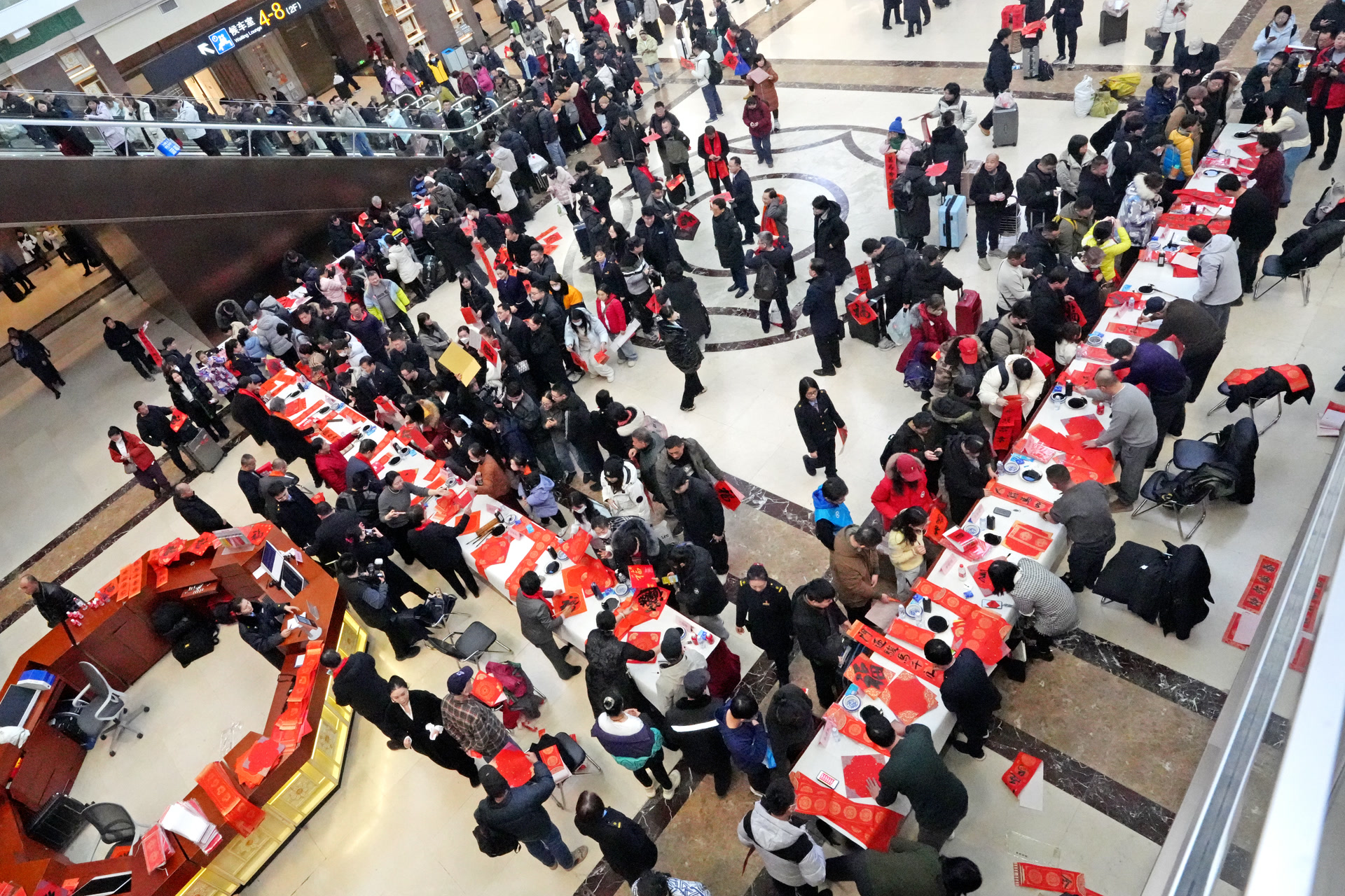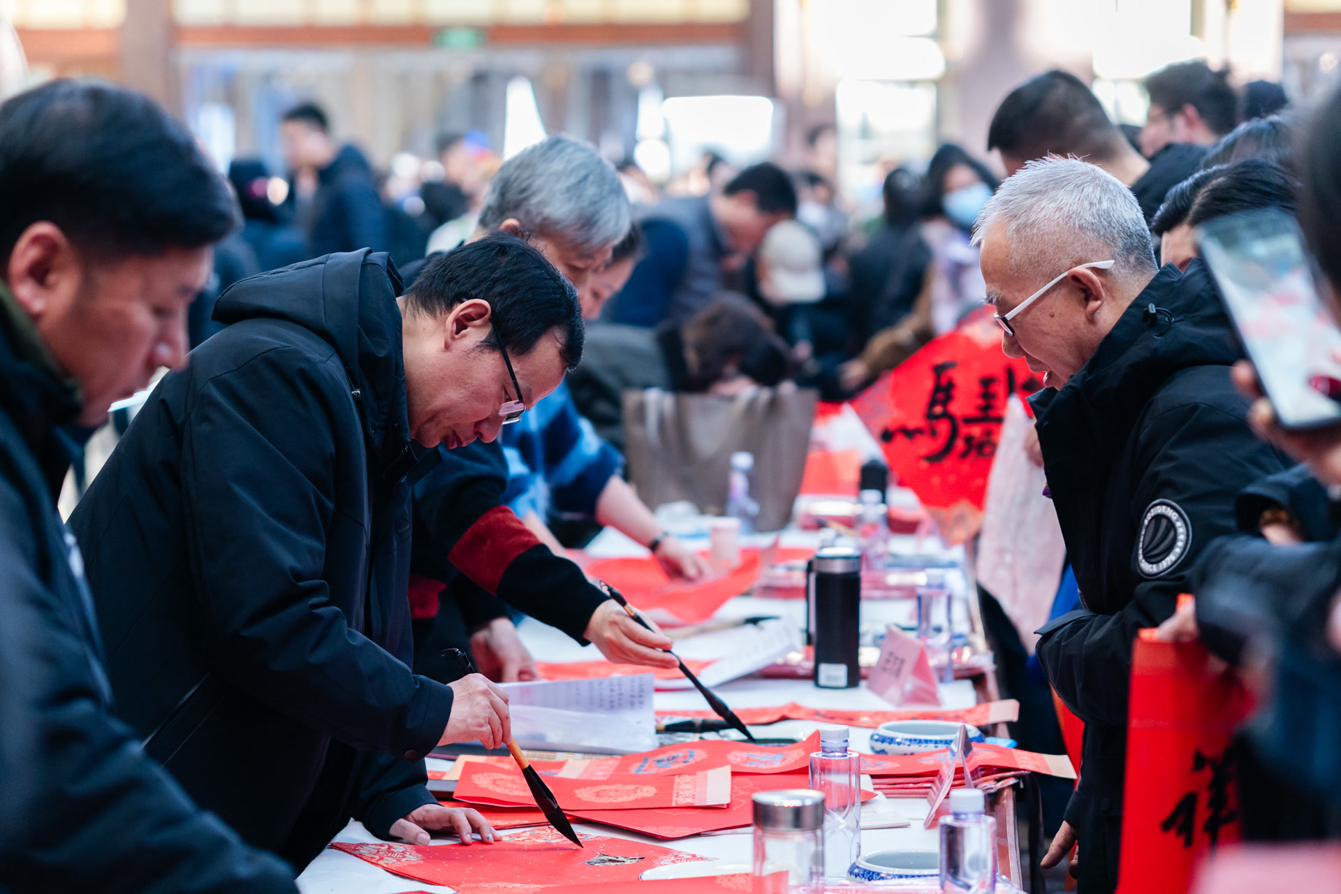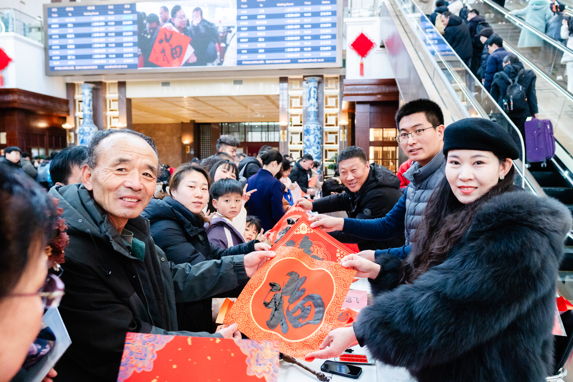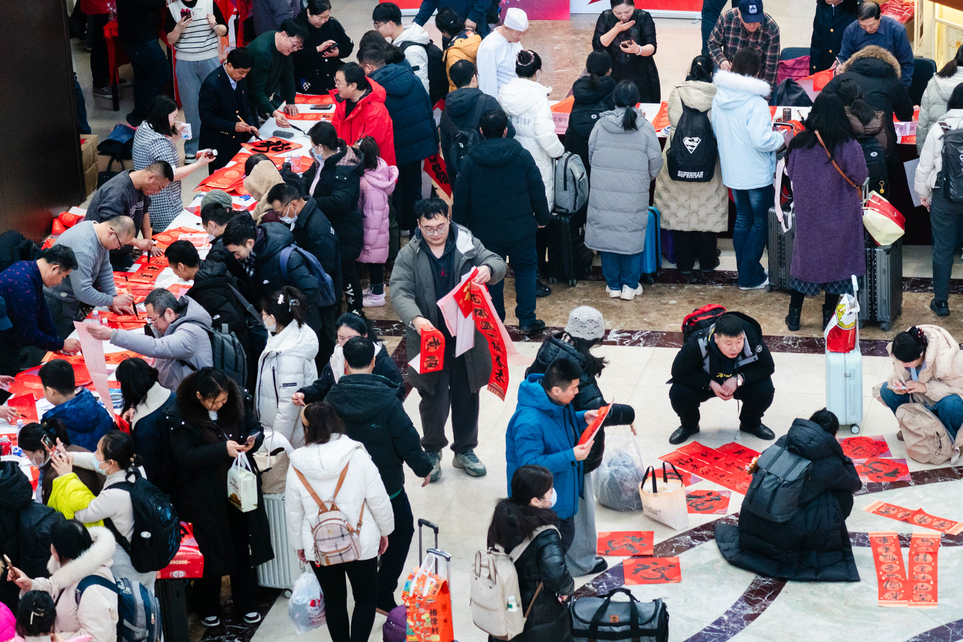 在短短一上午的时间里,书法家们共为旅客和一线职工书写、赠送春联及福字逾千幅。一张张福字、一副副春联被装进喜庆的红色福袋,伴随着旅客的脚步登上列车,将浓浓的年味和温暖的祝福带向四面八方、传递至千家万户。