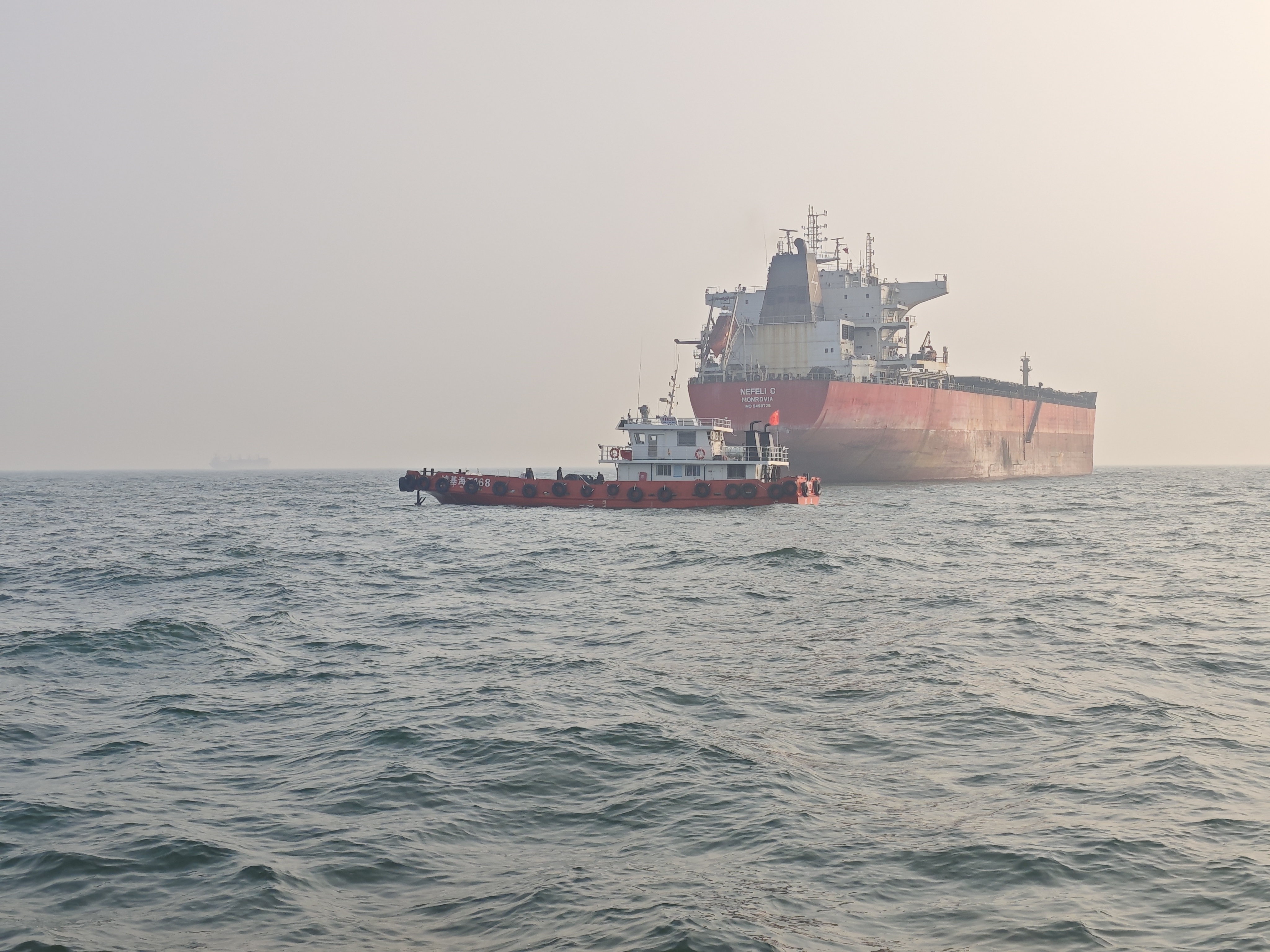 “看,那艘船在干什么,会不会是非法搭靠?”记者发出疑问。不远处,一艘小船正停在货轮旁边。