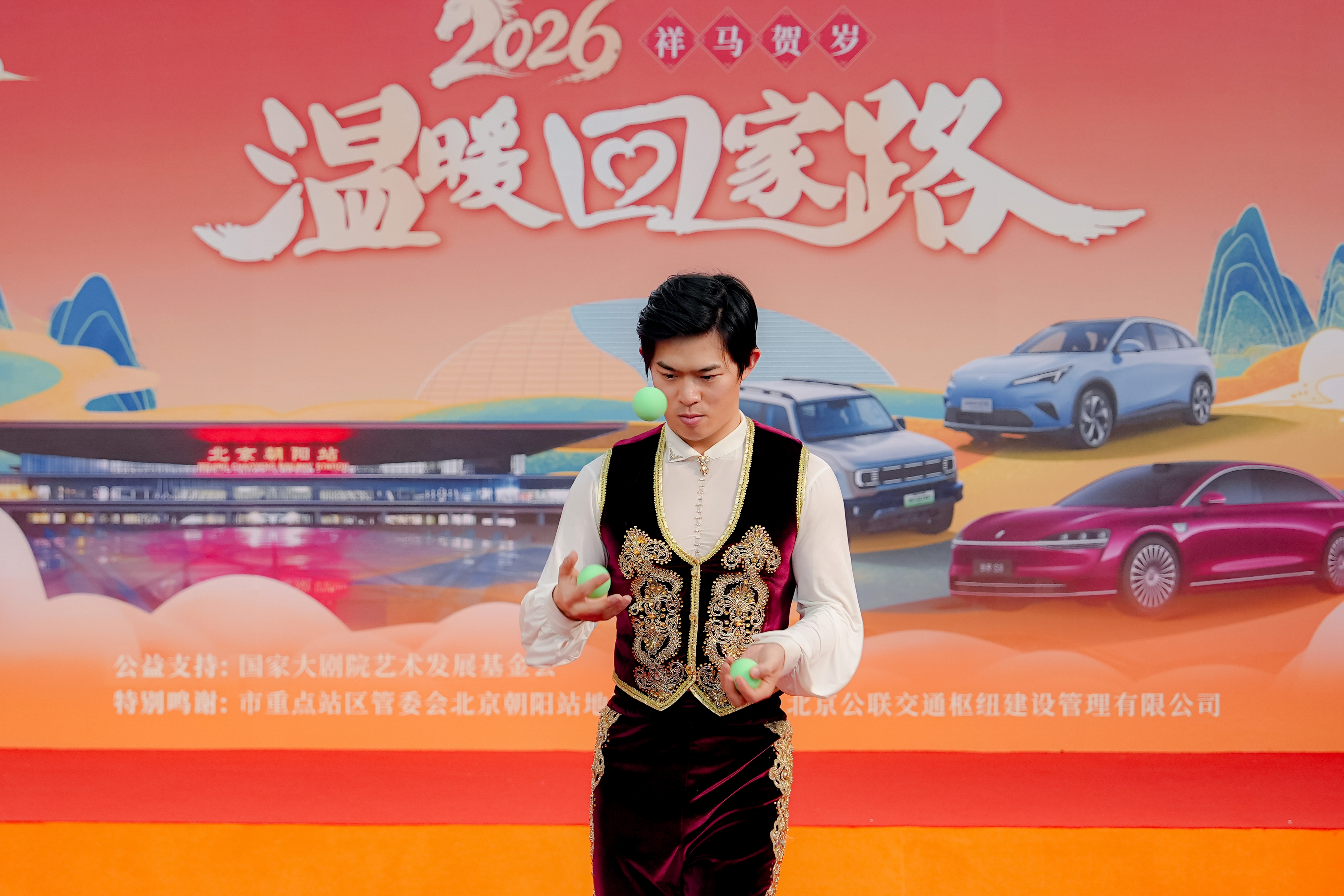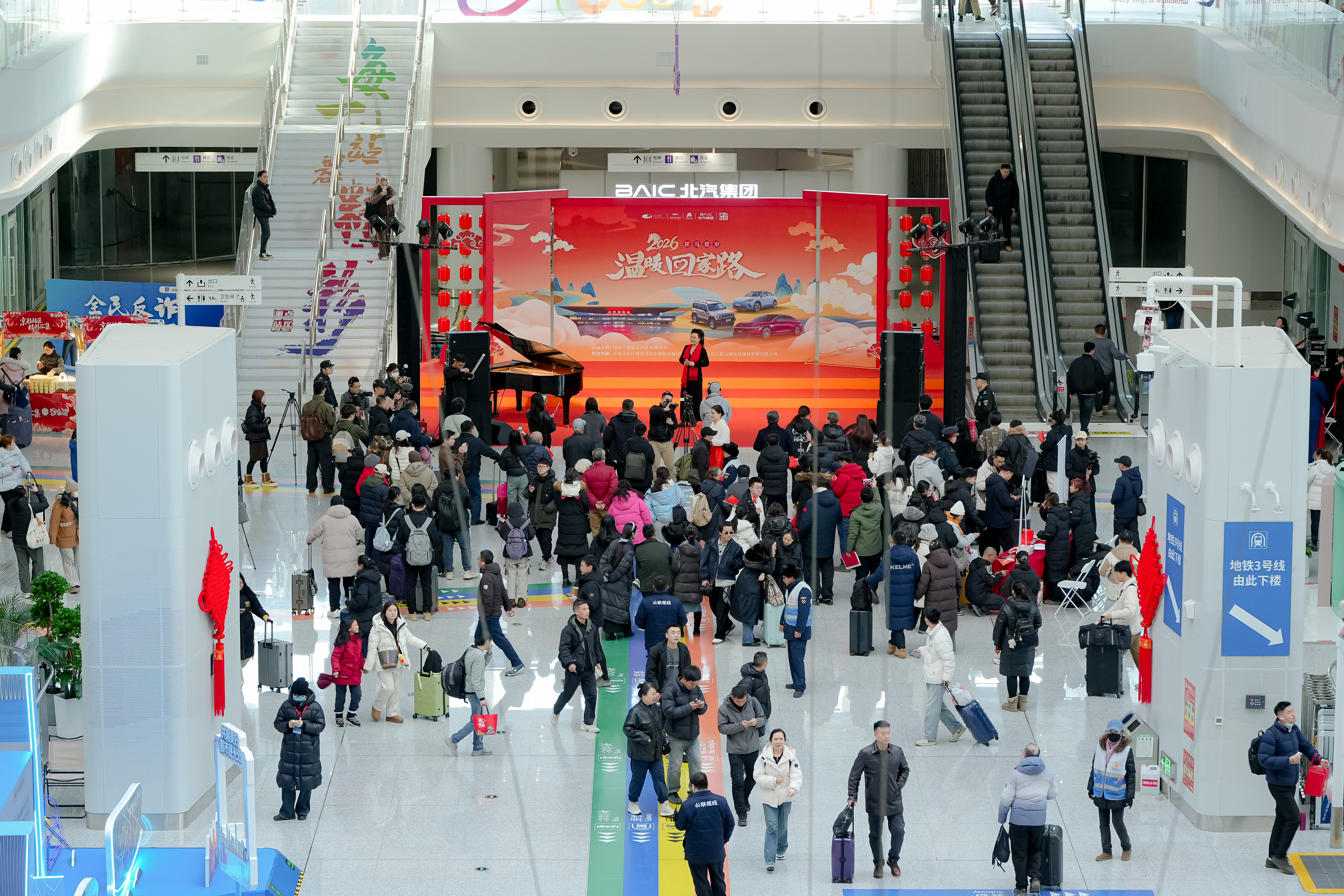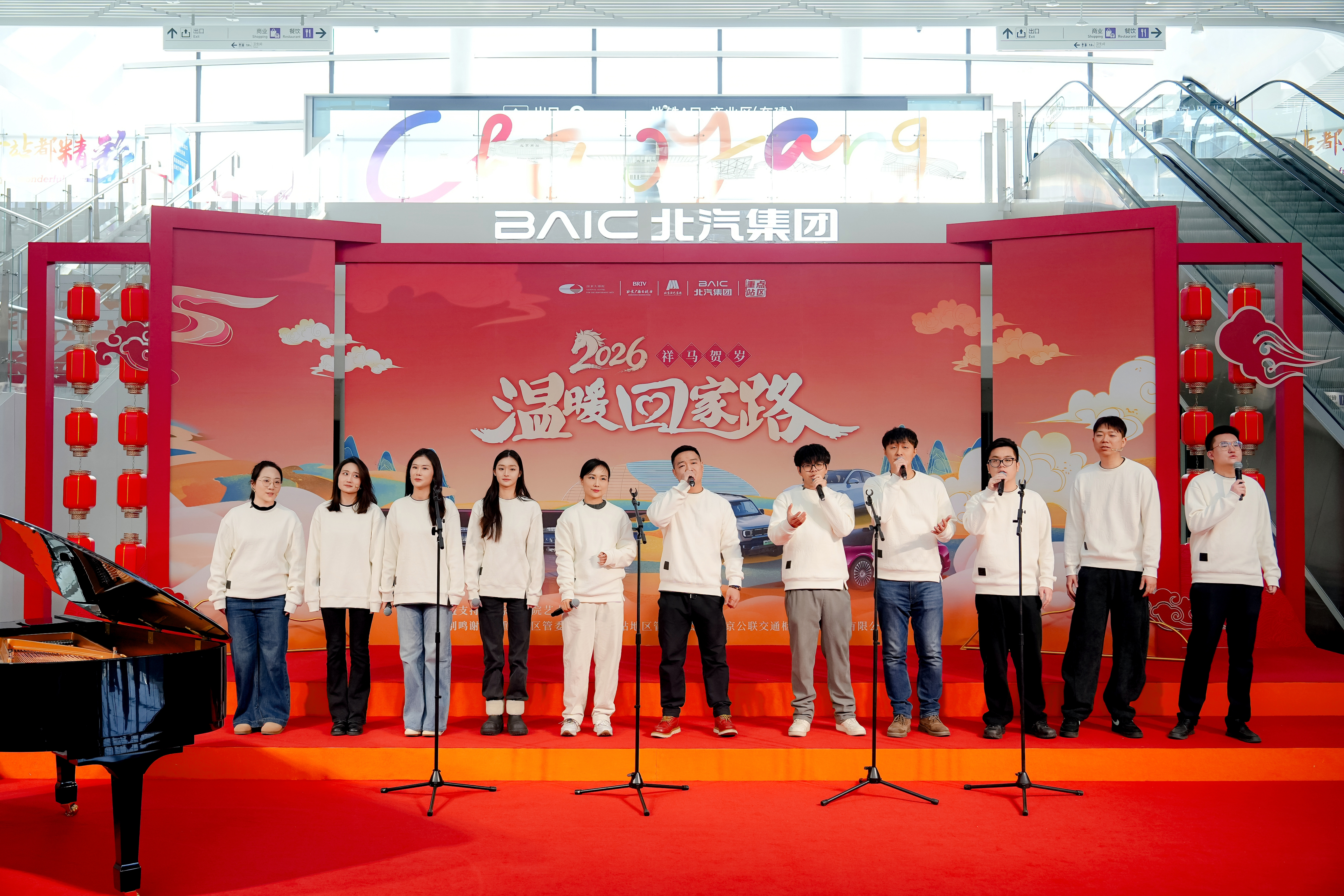 北京朝阳站宽敞明亮的枢纽大厅里,北汽青年合唱团上演惊喜快闪,国家大剧院的艺术家们带来表演,使原本步履匆匆的旅客纷纷驻足,目光被这突如其来的美好点亮;旅客和表演者集体大合唱《我和我的祖国》,将现场氛围推向高潮……快门声、掌声与欢呼声交织,把归途的期待、相聚的温暖、城市的活力融为一体,让每一位途经者都在旅途之中,邂逅不期而遇的美好与祝福。2月11日至14日,北汽集团联手国家大剧院艺术发展基金会、北京广播电视台、北京演艺集团,在朝阳站持续进行“温暖回家路”公益演出,带来快闪、独唱、合唱、魔术、乐队合奏等节目,为广大旅客献上一场“沉浸式”的文化体验,营造热闹团圆、喜庆祥和的节日氛围,让广大旅客开开心心踏上回家的列车。旅客们现场打卡,拍摄带有北汽元素的暖心时刻,发布在社交平台,即可抽取精美礼品。