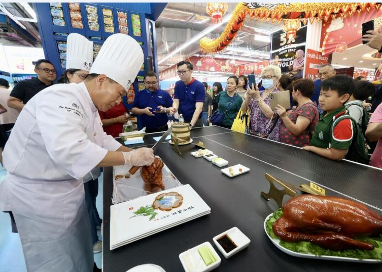 2026年2月9日,新加坡裕廊坊霸级超市(FairPrice Xtra)里,一场充满京味的展示吸引了众多顾客。全聚德挂炉烤鸭技艺第六代传承人吴玉波手持片鸭刀,行云流水般地将一只枣红色烤鸭片成均匀的薄片,印有全聚德标志的“手工片制烤鸭”正式在中国境外首发,以匠心技艺与创新产品,让百年京味香飘东南亚。