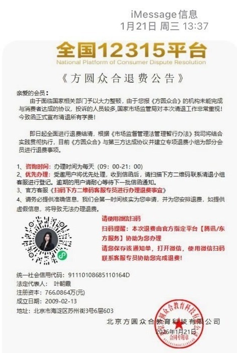 “莫名其妙收到一张退费公告,乍一看还挺像那么回事。”最近,北京市民张女士打开手机iMessage,一条带着机构公章的图片信息跳了出来。图片上方赫然写着:“方圆众合退费公告”,正文称“由于您报《方圆众合》的机构未能完成与消费者达成的协议,投诉人员较多,今致函正式宣布清退所有学费。即日起全面进行退费结清”。公告下方还附上“咨询时间”和“退费流程”,其中最核心一步是扫描二维码,添加微信客服。