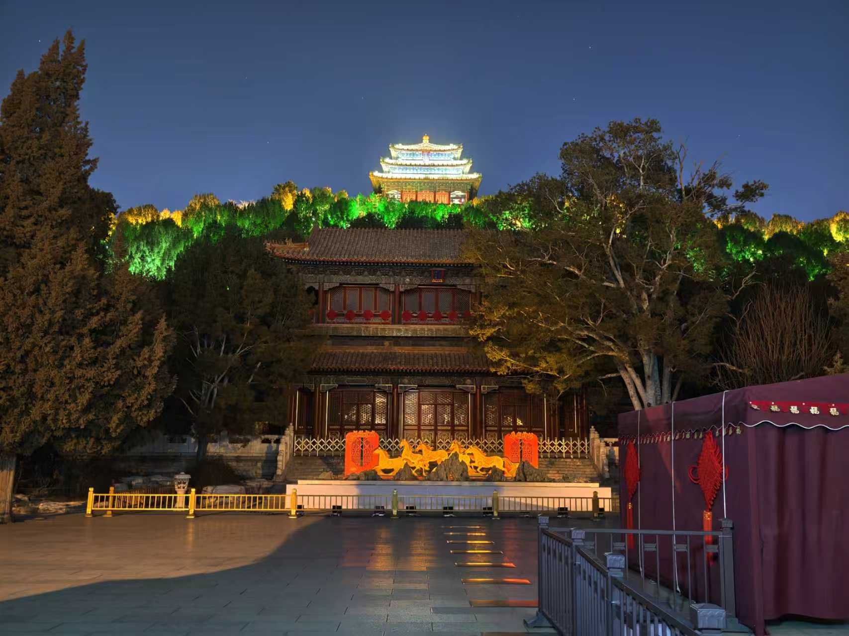 南门“五骏迎春”、东门“福马贺岁”、西区科普园“福马迎春”等多组新春景观小品也将点亮,寓意奔腾向前、福满全园。节日期间,万春亭等山体五亭、寿皇殿建筑群夜景照明同步点亮。光影流转,为晚间游园增添浪漫与诗意。