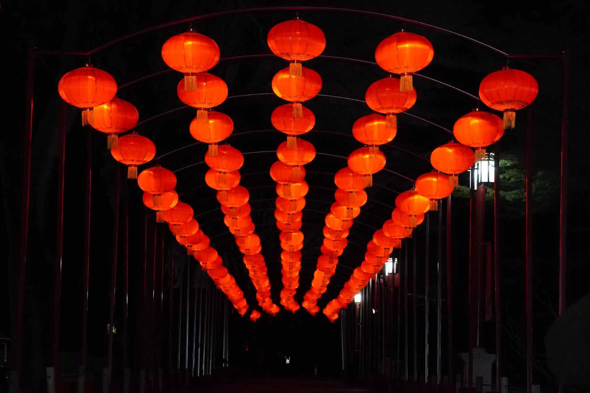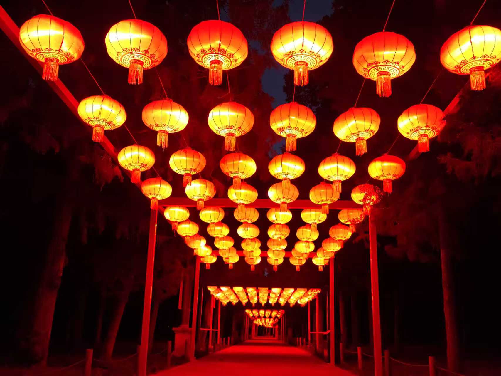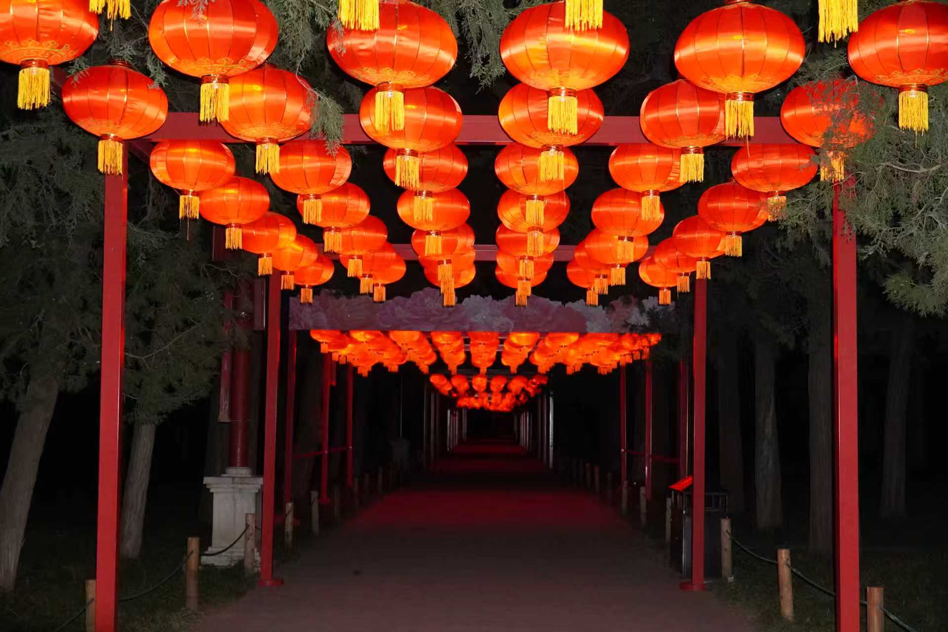 全园悬挂约2000盏各式灯笼,夜幕降临便化作“光影景山”。万春亭平台50组仿古六边形灯笼将与古建照明同步亮起,点亮夜色。后山主路架起“春”字拱门,600余盏灯笼绵延成流光长廊,一步一景,年韵悠长。