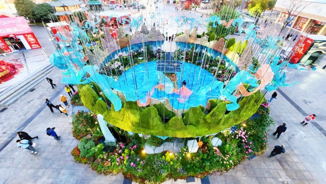 提取云南“山水花都”“蝴蝶王国”的花、蝶元素,融合“日进斗金”聚水聚气聚财装置打造纳福景观,又将水元素抽象为鱼形、花瀑,寄寓新春年年有余、顺风顺水的美好祈愿。