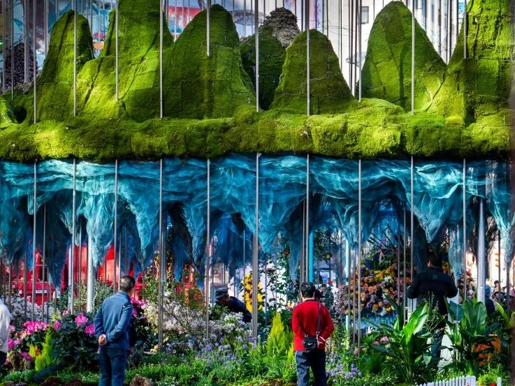 茶花配骏马,一组充满巧思的花雕同样不容错过。一匹神骏,姿态昂扬,营造出新春氛围;另一侧周围簇拥着以繁花装置,并搭配色彩缤纷的花墙,新年新气象,寓意“万事皆好”。
