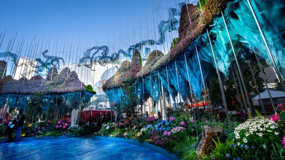 景观运用高山杜鹃、云南山茶等50余种乡土花卉植物,依托昆明“山水相依”的自然环境,通过山峦叠翠、碧水环绕的景观架构,结合高原明珠滇池睡美人的朦胧意境,加上光影装置与本土植物花卉群落,打造主题为“观山·观水·观春城”的大型艺术沉浸式立体花雕。作品主题鲜明、造型新颖、内涵丰富,充分展现昆明生态宜居、开放包容的城市形象,诠释着“花满春城”独有的昆明慢生活哲学。
