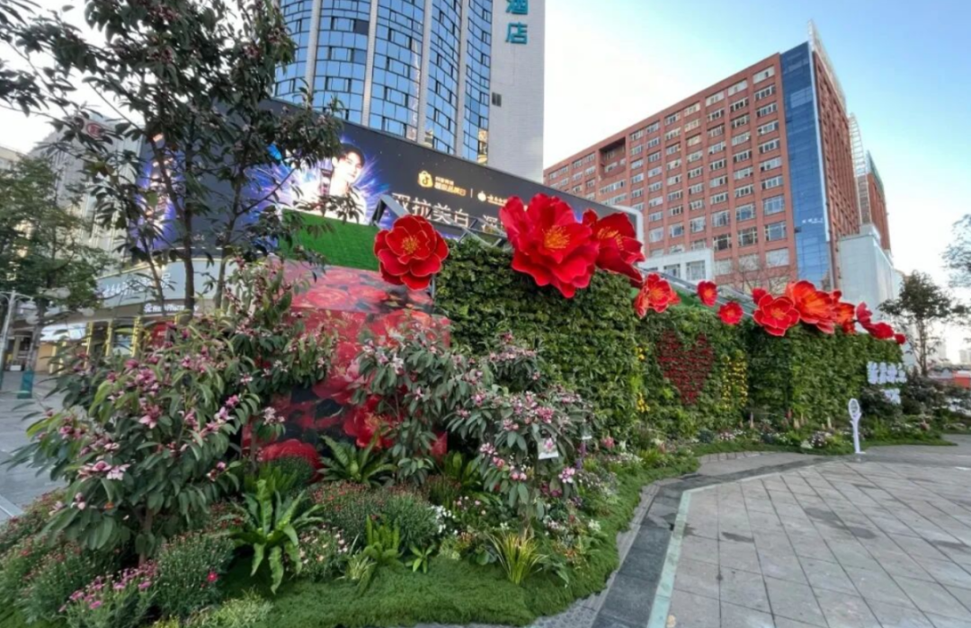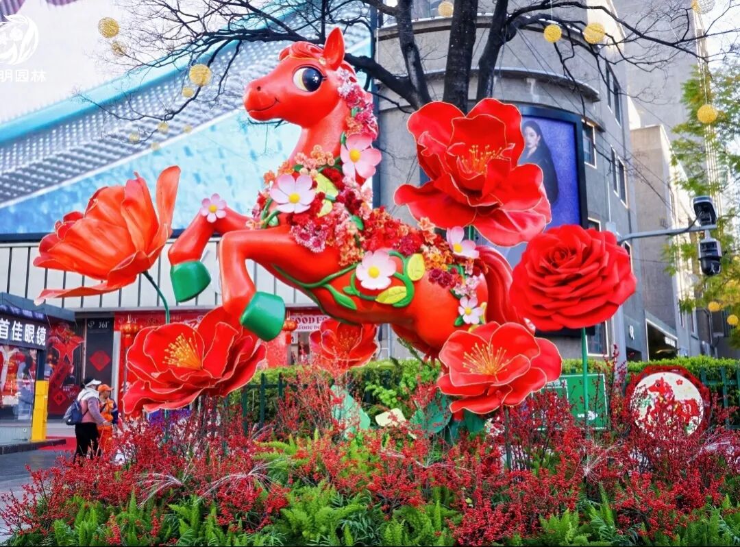 提取昆明市花山茶、大众喜爱的月季元素打造立体花艺,结合“小萌马”艺术装置,搭配夜景灯光,营造新春吉庆氛围,寄寓新春万事顺遂的美好期许。