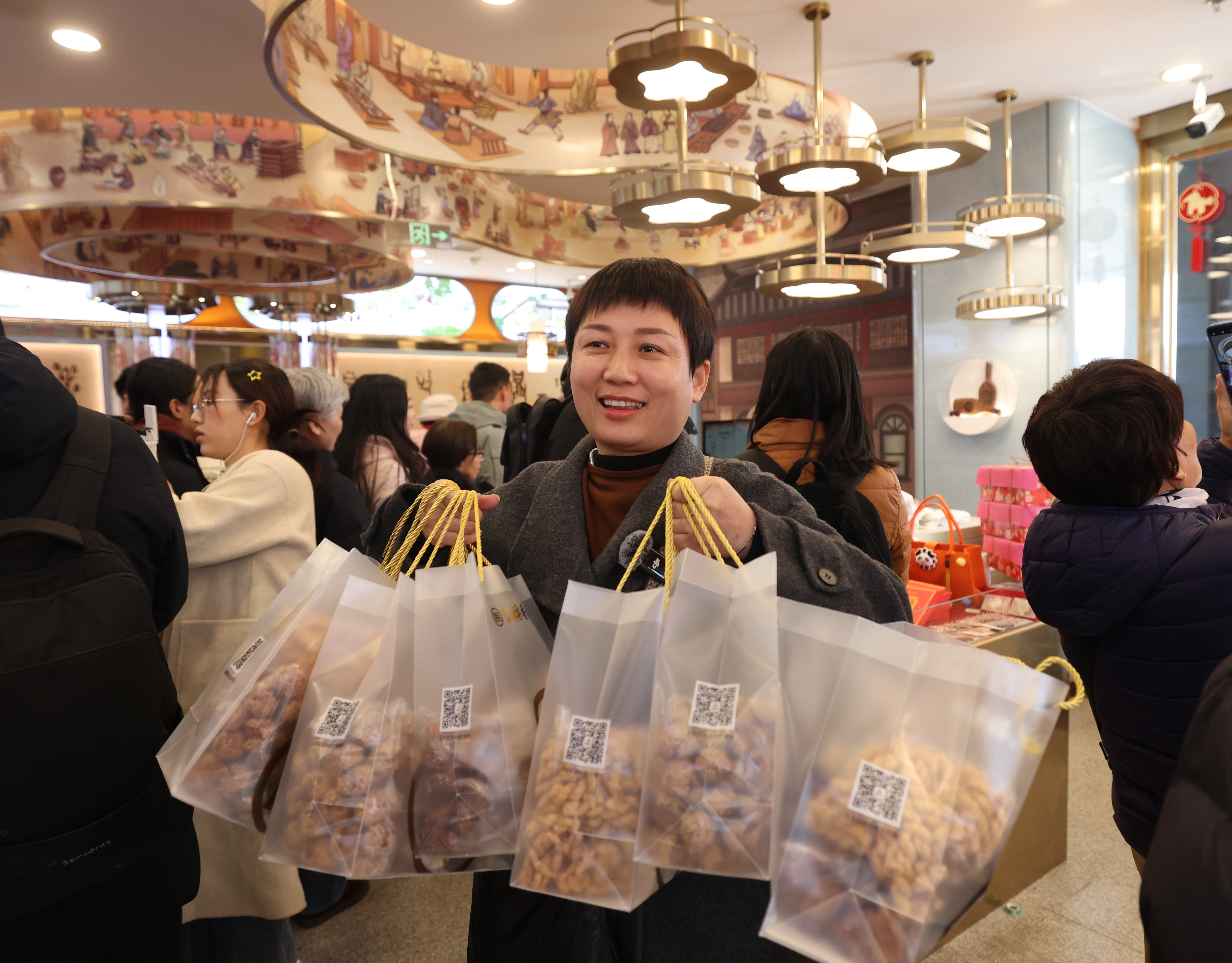 2月12日,隆福寺北京稻香村门店的年货“三件套”——蜜三刀、奶油麻花和开花枣,依旧是新春市集的“人气王”,店内挤满了排队购买“三件套”的市民与游客,几乎无处下脚。