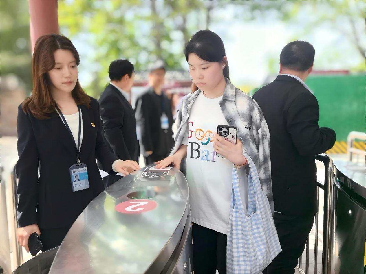 2024年“五一”假期高峰时段,检票闸机突发故障,数万游客滞留入口。“稳住场面、安全第一”成为王新梦的第一反应。她立即上报、启动预案,将班组兵分两路,一组增开临时窗口,转为人工核验,加速分流;另一组赶赴前端设置隔离线、安抚情绪、引导排队。她全程协调,联动驻点民警与安保力量,高效化解拥堵。“事后大家虽然疲惫,却都相视而笑,因为我们共同守住了这道关。”王新梦说。