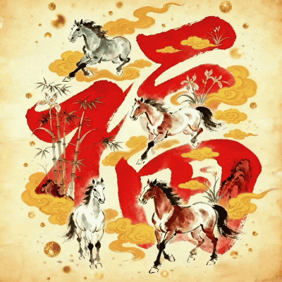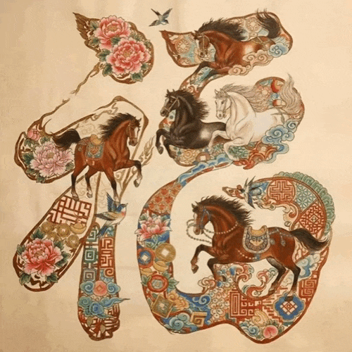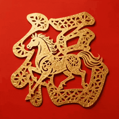 作品采用金色剪纸质感,搭配梅花、铜钱、祥云等传统纹样,体现马年奔腾向上的精神,传递“福满门庭”的吉祥寓意。