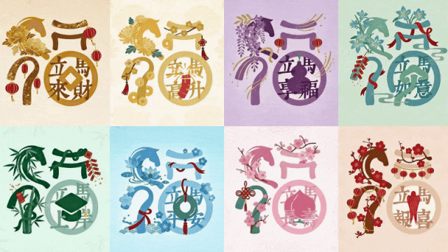 《立马呈祥》将文字结构、生肖意象与传统吉祥文化相结合,形成系统而丰富的视觉表达。每一个“福”字均融入不同寓意,如“马到成功”“学业有成”“岁岁平安”“良缘喜事”“步步高升”等。整体造型以“马”的轮廓为视觉线索,借助植物、器物与节庆符号,使生肖元素自然嵌入字体结构之中。色彩上采用金、绿、蓝、粉、紫等多元配色,在喜庆中呈现层次变化。