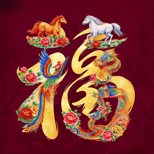 《马上有福》以书法“福”字为骨架,将工笔重彩风格与数字动效相结合,画面中五匹骏马穿行于祥云牡丹间,寓意五福临门、马上有福。
