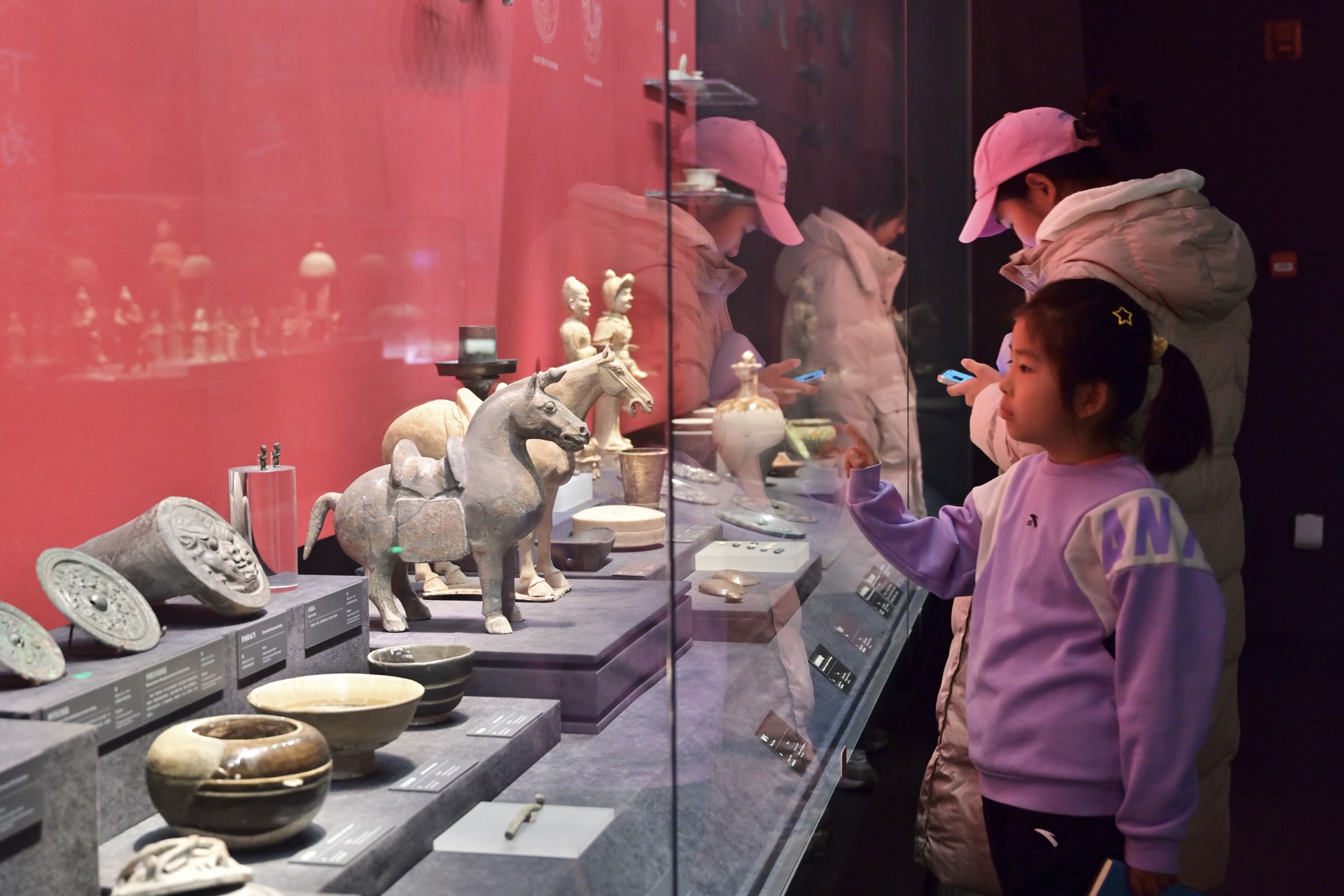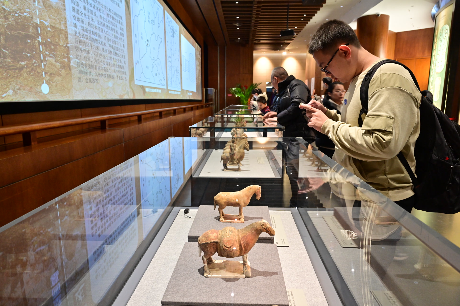 记者注意到,馆内的“文物探中华:河北磁县湾漳北朝壁画墓出土陶俑展”人气倍儿旺。展柜中,20余件北朝陶俑策马驰骋而来,威风凛凛,十分吸睛。观众李园为每一件文物都拍了照片,他说,“仔细观察,每一匹马、每个人物的神态和细节都不一样,这么多马文物集中展示,看得过瘾。”