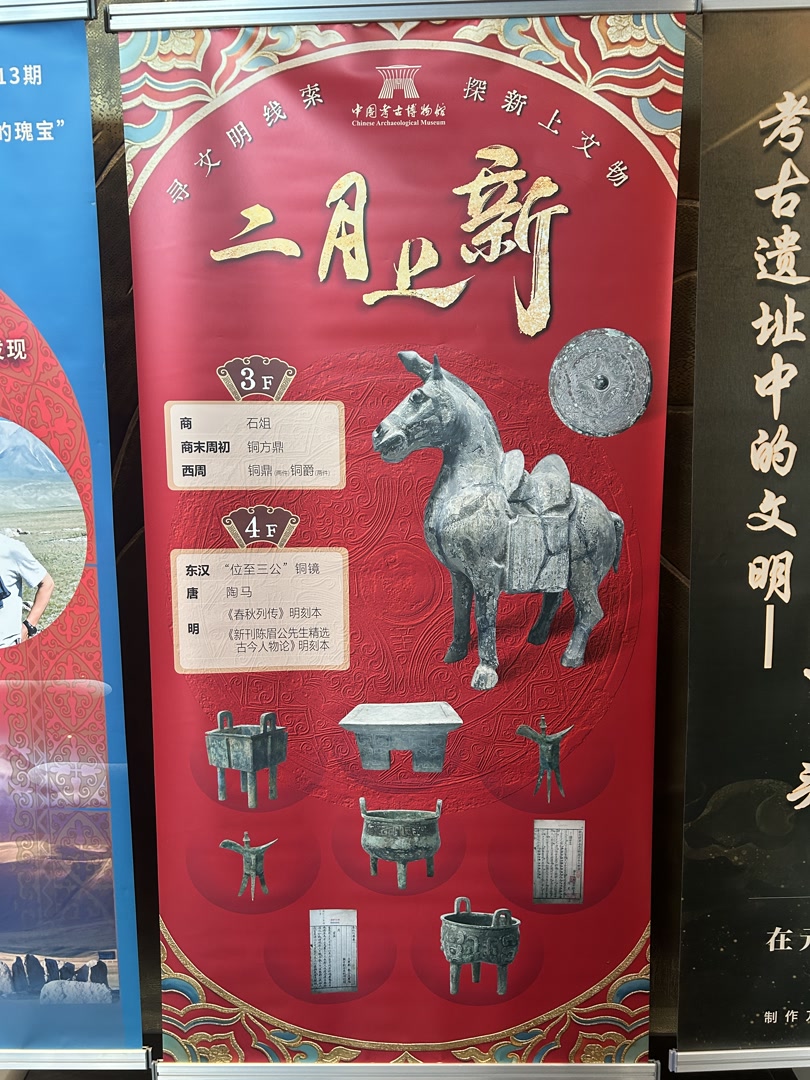 中国考古博物馆的新春元素已就位, “一马当先,龙马精神,马跃新程……”一幅幅吉祥话展板引领观众走进馆内。“2月文物上新”海报新鲜出炉,唐代陶马领衔10件文物入藏基本陈列,邀观众开启新一轮“寻宝”之旅。