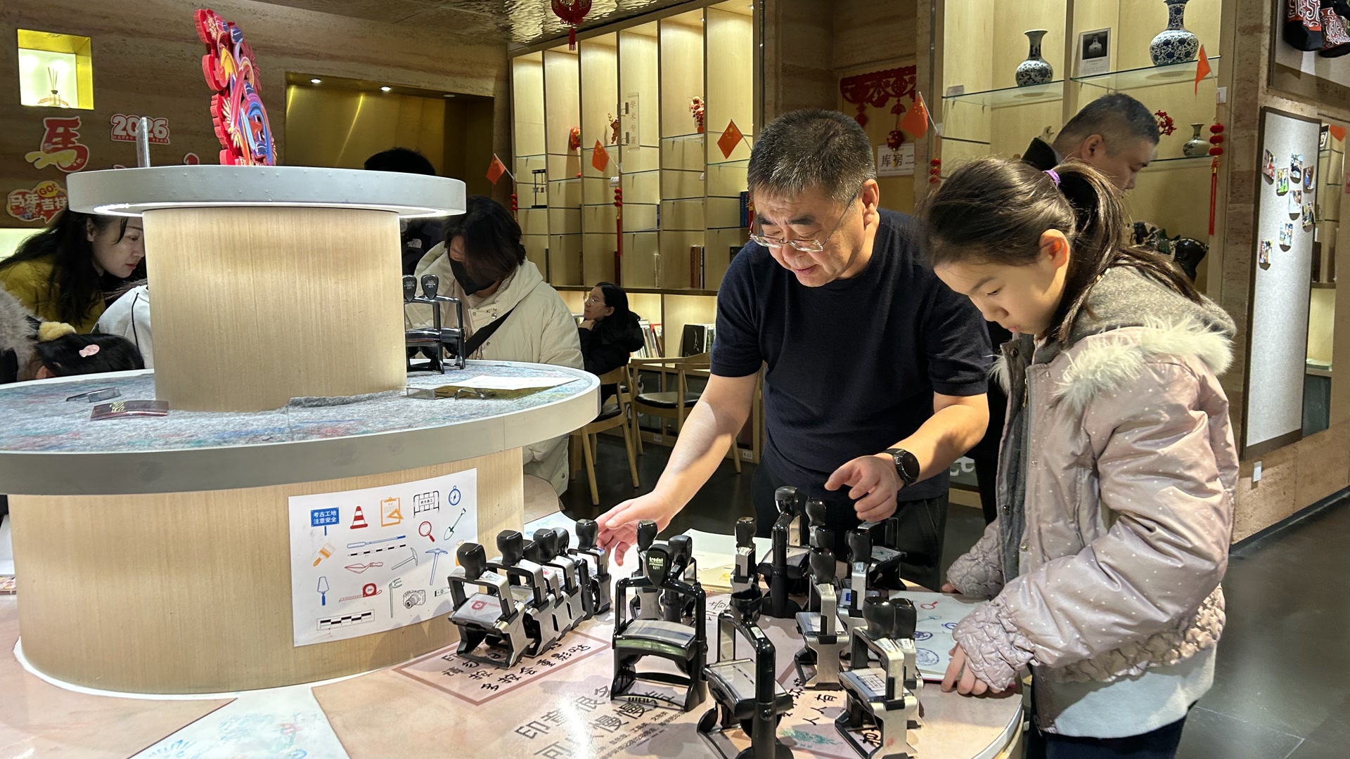 “真是一场酣畅淋漓的集章打卡啊!”文创空间内,37枚印章集体上新,令集章爱好者直呼过瘾。马年主题印章中,竹子、牡丹、柿子、如意等代表不同吉祥寓意的图案被卡通小马背在背上,配以“福禄双全”“一帆风顺”“国泰民康”的祝福语。考古学家的手铲、刷子、放大镜等工具也化作印章图案,让观众把新春祝福和考古元素带回家。