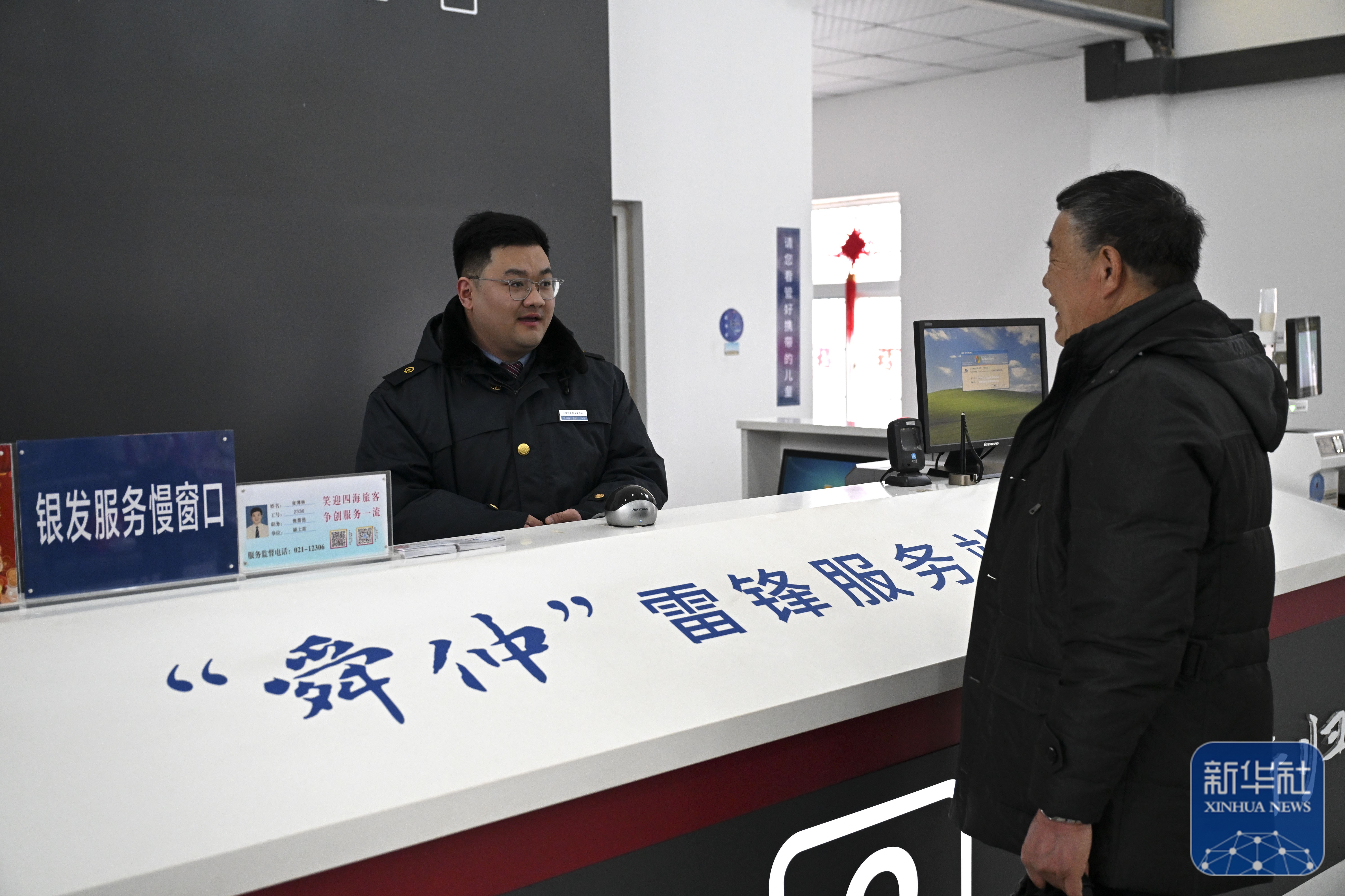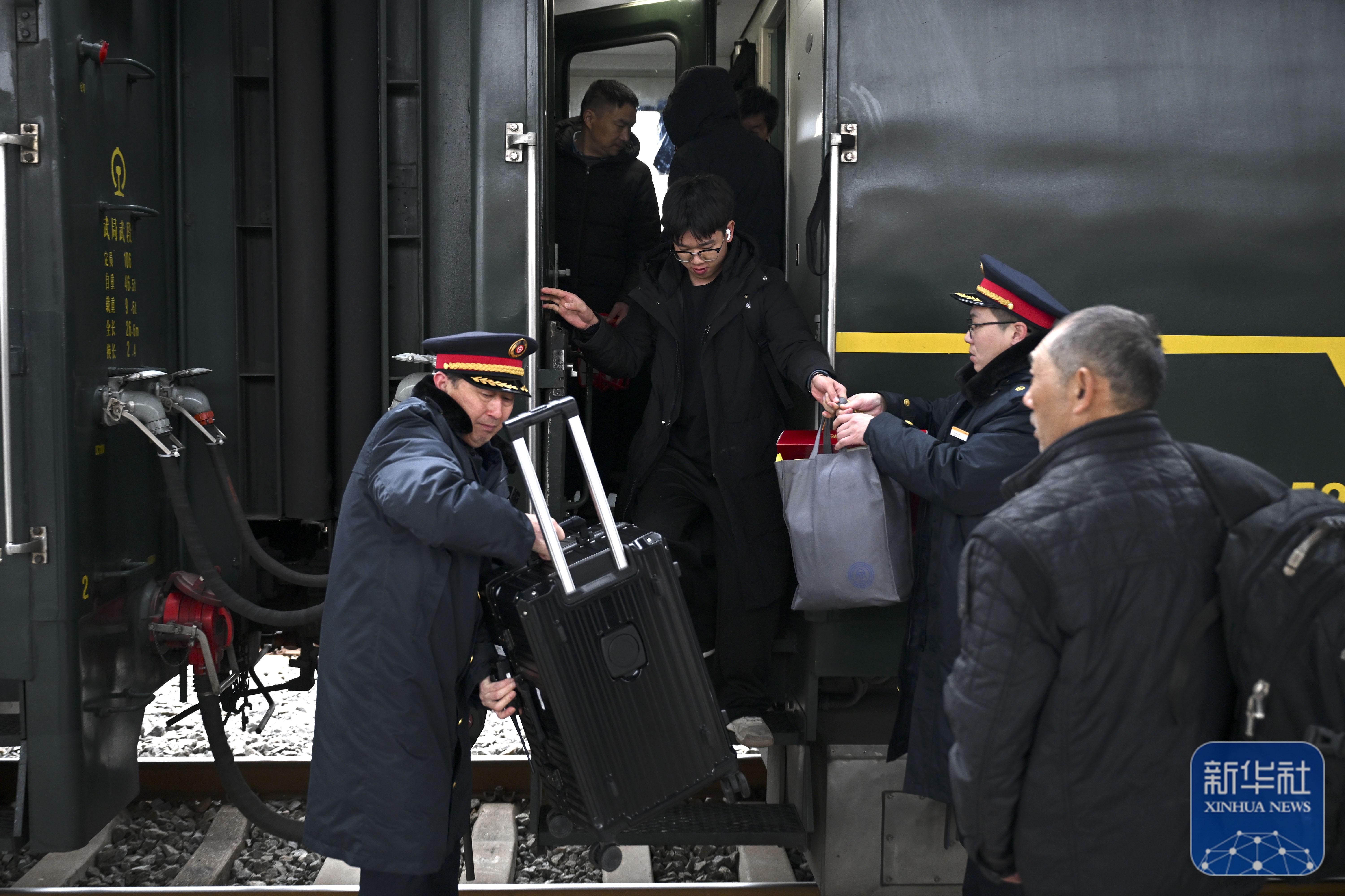 ↑ 2月6日,颍上站客运值班员贾贵军(左一)在站台协助旅客下车。新华社记者 黄博涵 摄影报道