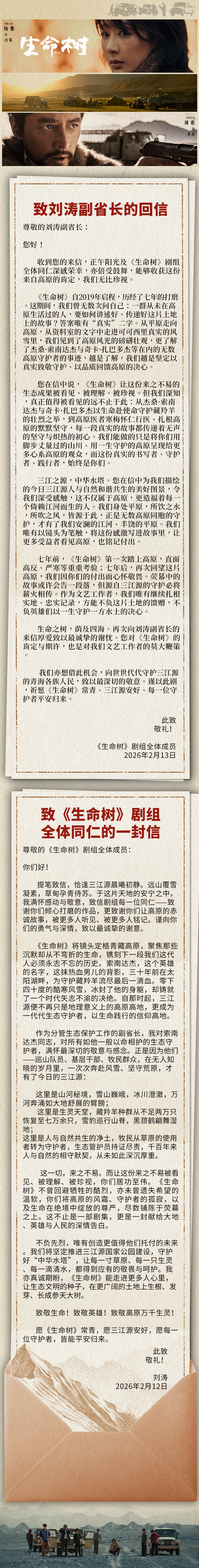 2月13日,正午阳光影业发布《生命树》剧组全体同仁致青海省副省长刘涛的回信,回应此前副省长对剧集的肯定与寄语。