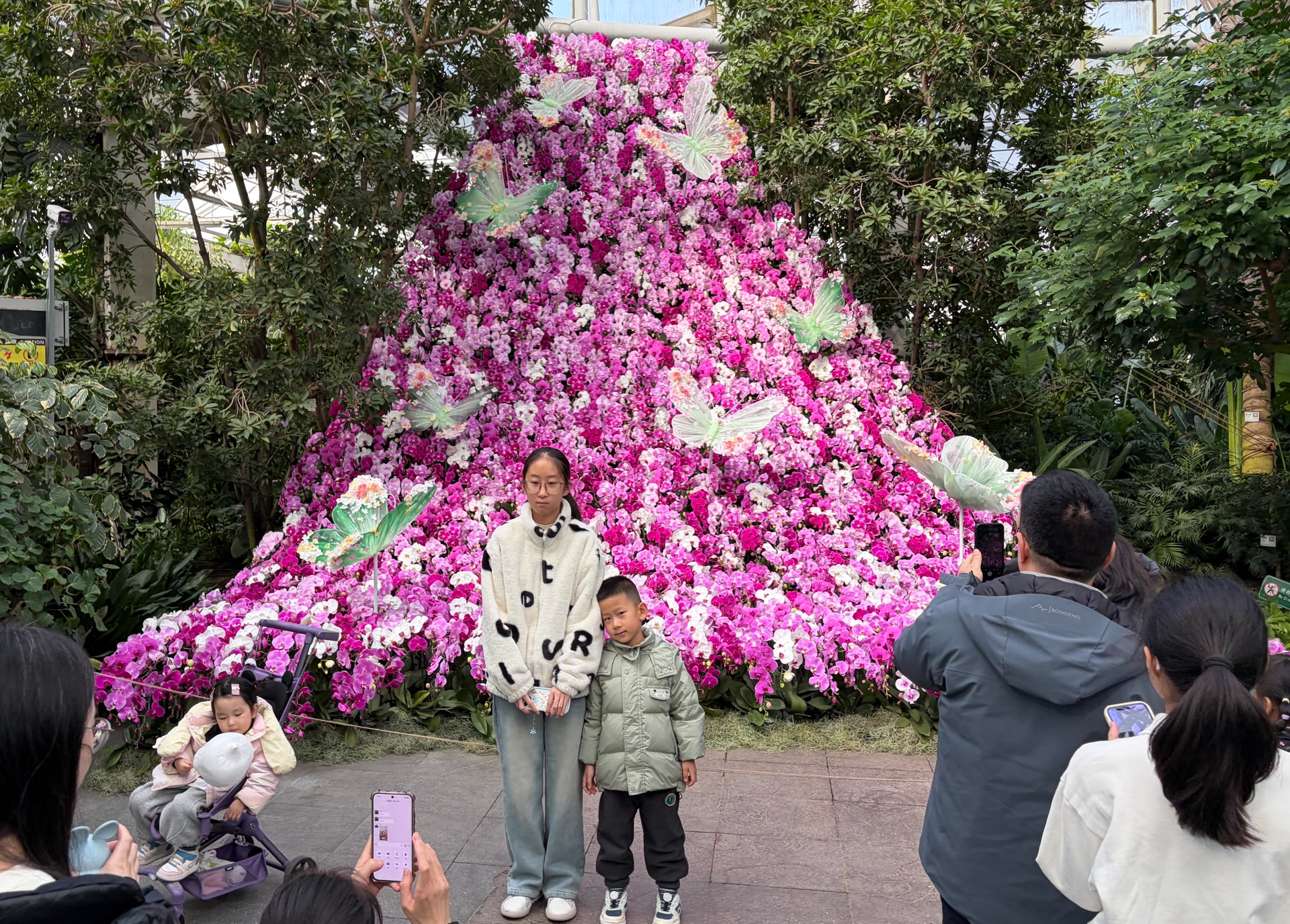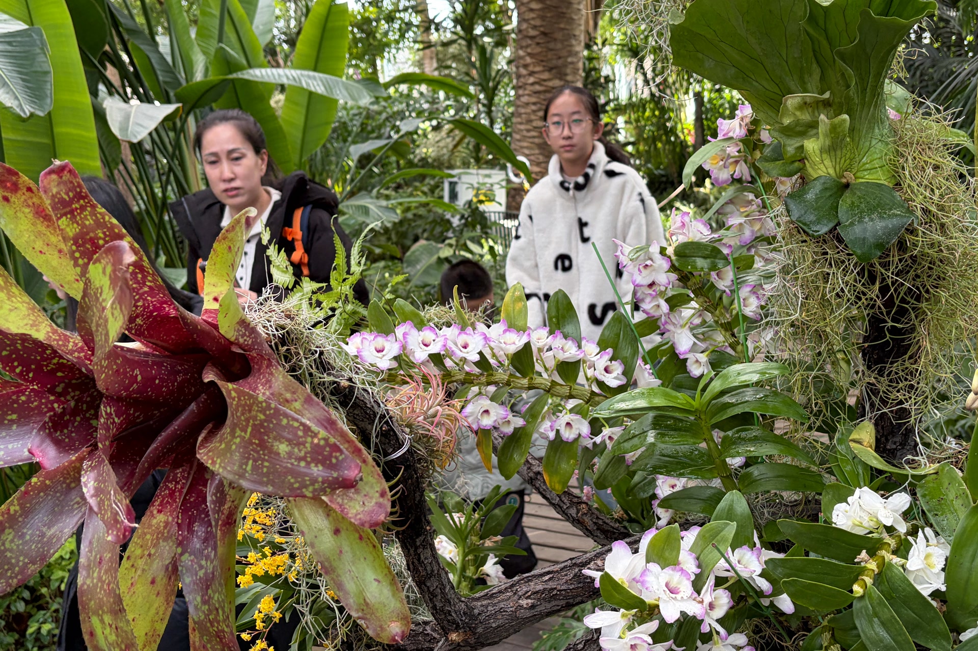室外是冬日严寒,室内是温暖如春。公园的六大主题温室里,超过2000种珍奇植物构成了一幅鲜活的画卷。沙漠植物馆内,龟甲龙静卧如远古遗珍,彩色多肉组成灵动的马年生肖图案,为人们送上马年的祝福;热带植物馆中,由3000株蝴蝶兰组成的立体花瀑沿高处倾泻而下,粉紫白三色交织,“蝴蝶”飞于其中,恍若置身童话森林。