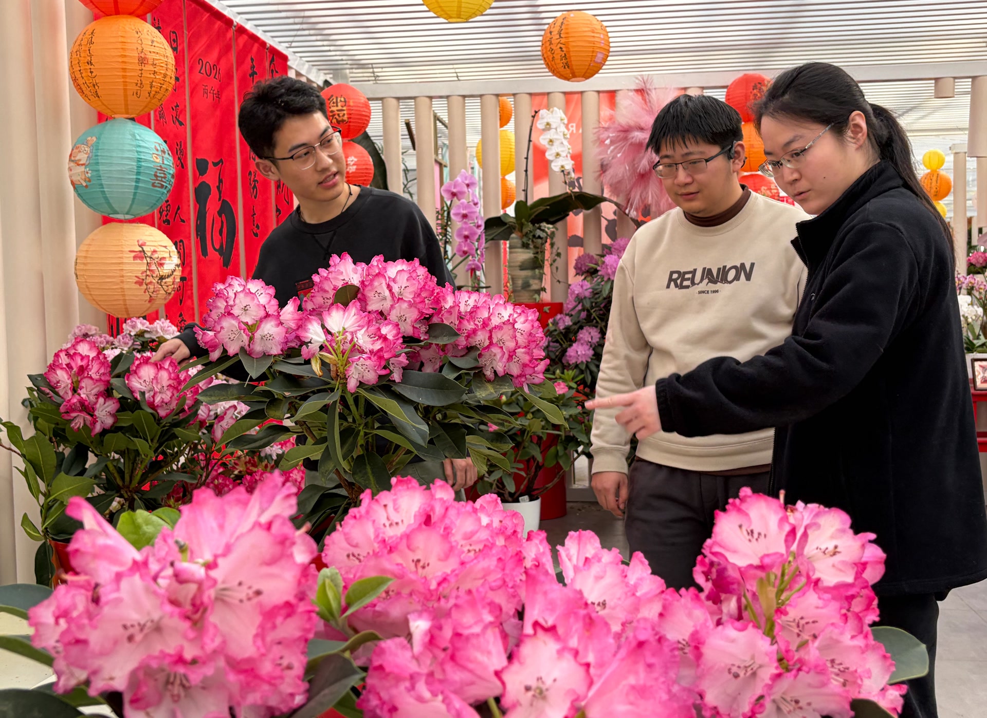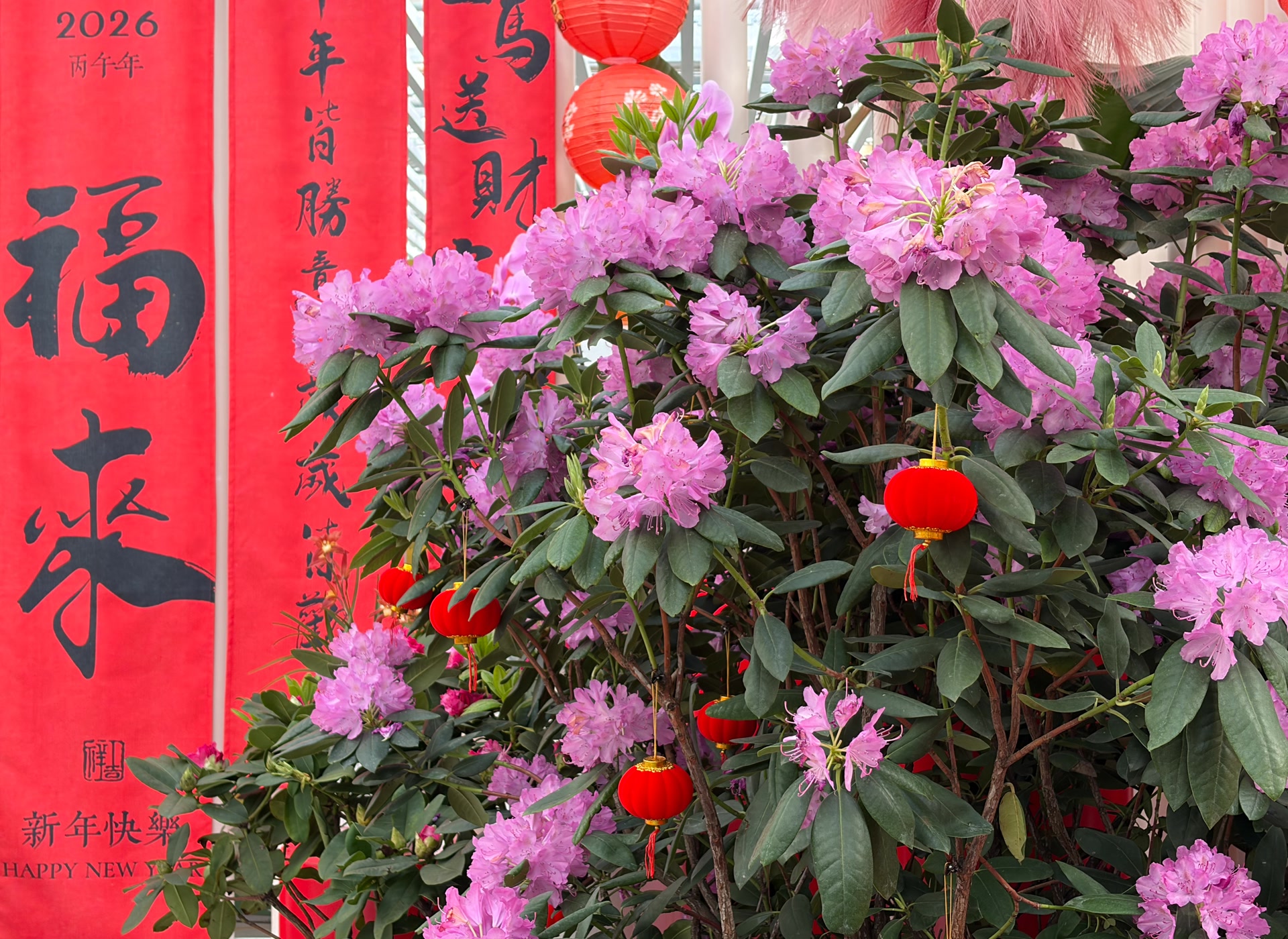 从南门进入世界花卉大观园,顺着右手的甬路前行,第一站就是科普大课堂,“高山杜鹃花展”就在这里举行。一进门,满目花开。紫色系的“优雅”轻盈飘逸,红色的“诺娃”为国际园艺获奖品种,复色的“贵妃”以硕大花型和绸缎光泽引人驻足,拥有悠久历史的“凯特”的紫色宛若梦幻……从经典红粉色系到复色、渐变品种,42个珍稀杜鹃品种,各具风姿。这些“山中锦绣”在温室内热烈盛放,花繁似锦,色艳如霞,其间还点缀着灯笼、春联等年味元素,形成富有东方意趣的观展氛围。