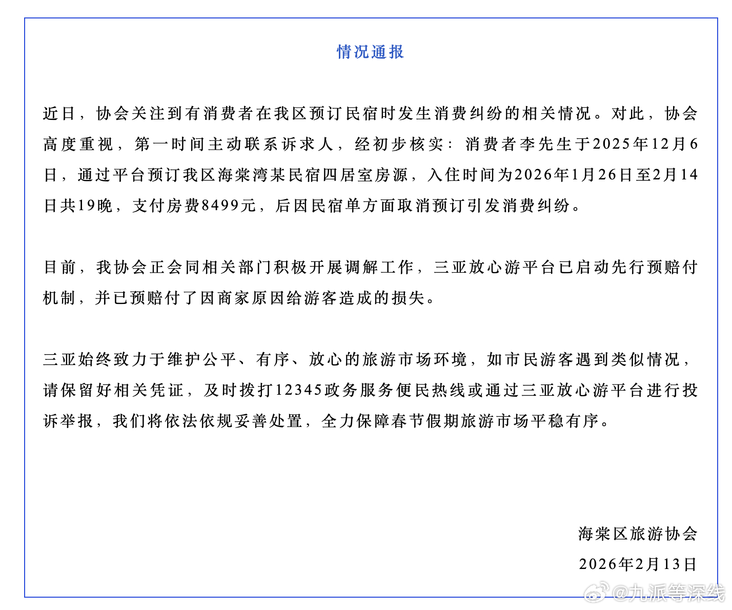 2月13日,@三亚市海棠区旅游协会 发布情况通报: