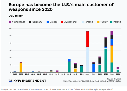 自2020年以来,欧洲已成为美国的主要武器供应方。图片来源:《基辅独立报》