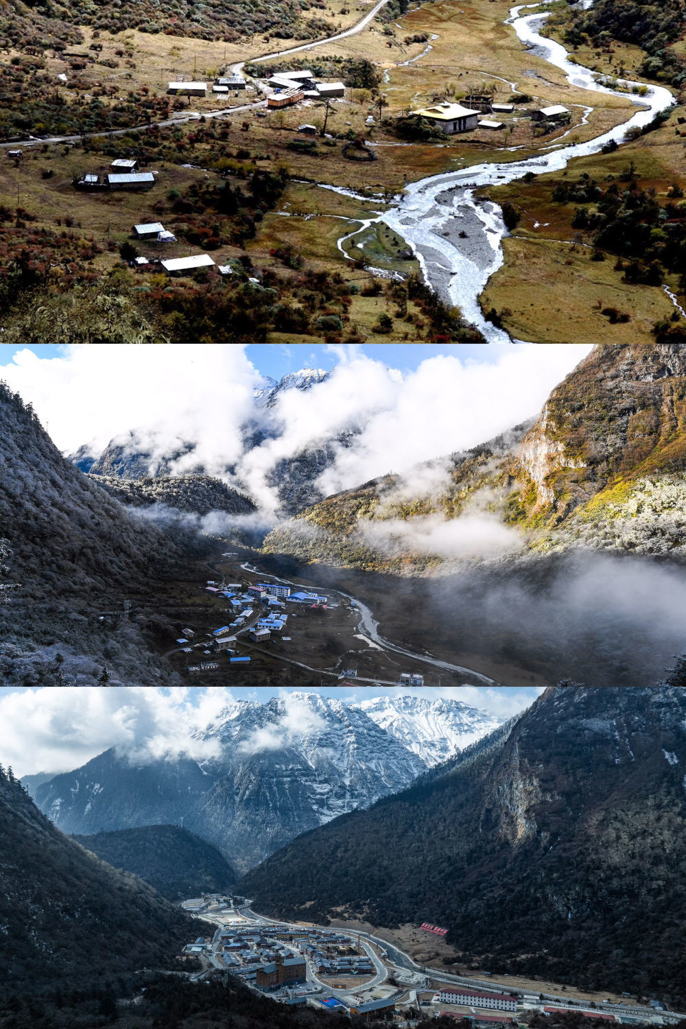 拼版照片:上图是2003年10月26日拍摄的玉麦乡(新华社记者 索朗罗布 摄);中图是2017年10月31日拍摄的玉麦乡(新华社记者 普布扎西 摄);下图是2026年2月5日拍摄的玉麦乡(无人机照片,新华社记者 丁增尼达 摄)。