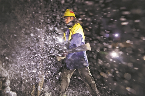 因为近期温差大,隧道里的冰形成很快,需要间隔两三天除一次冰。洞壁和地面的冰好处理,洞顶上方则需要搭梯子,用电钻打冰。寒风里冰坚如铁,在梯子上既要保持平衡又要发力钻冰,没几下,小伙子的帽檐下就已沁出汗珠,刘鹏伟开玩笑说:“别看我们工区胖子多,关键时刻顶得上。”