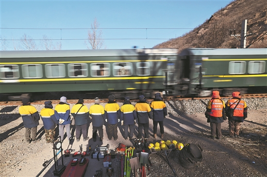 2月5日上午,即将在钢轨上作业的工人避让过往列车。