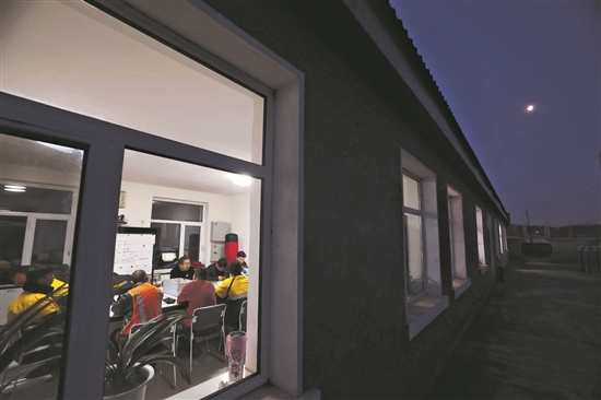 2月5日早晨6点50分,工人开早会布置当天工作。