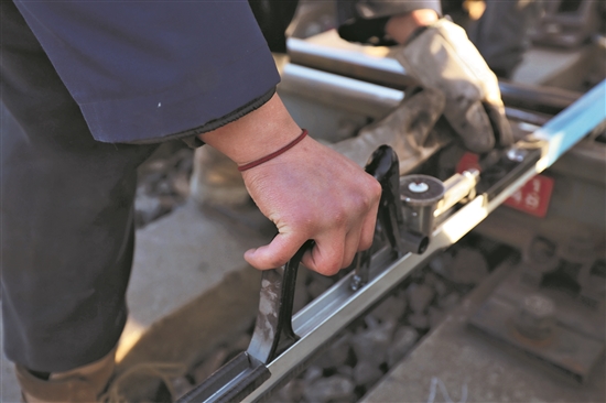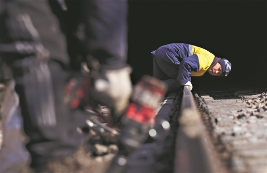 2月4日,鲍有春师傅趴在地上查看钢轨平整度。