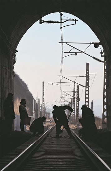 2月4日,刘鹏伟(左二)和工友在红旗隧道内查看钢轨受损情况。