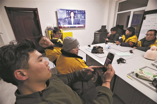 2月5日,工长刘鹏伟(左一)为大家展示刚刚录制的央视《新闻联播》里有关他们工作的几秒钟画面。