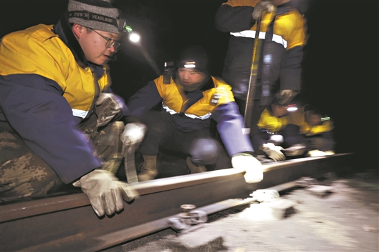 红旗隧道内,打冰结束后,工人们又投入到钢轨整修中,用量道尺测量钢轨间距和水平、打手电看钢轨平整度。黑暗的隧道内,时不时传来吆喝声和刺耳的电钻声,头灯不断闪烁,大家各司其职,忙而不乱。