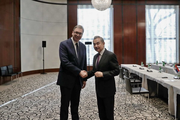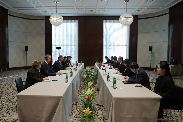 当地时间2026年2月13日,塞尔维亚总统武契奇在慕尼黑安全会议期间会见中共中央政治局委员、外交部长王毅。
