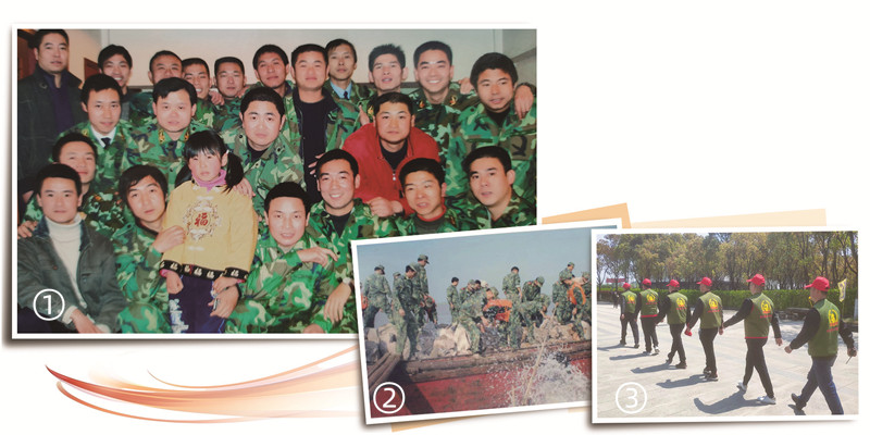 图①:2008年春节,郑菘芳(前排左三)与“兵爸爸”们聚会时合影。方贤松摄 图②:1998年抗洪期间,武警湖北总队官兵封堵管涌。资料照片 图③:2021年4月,“平湖市老兵爱心接力团”开展志愿服务期间留影。方贤松摄