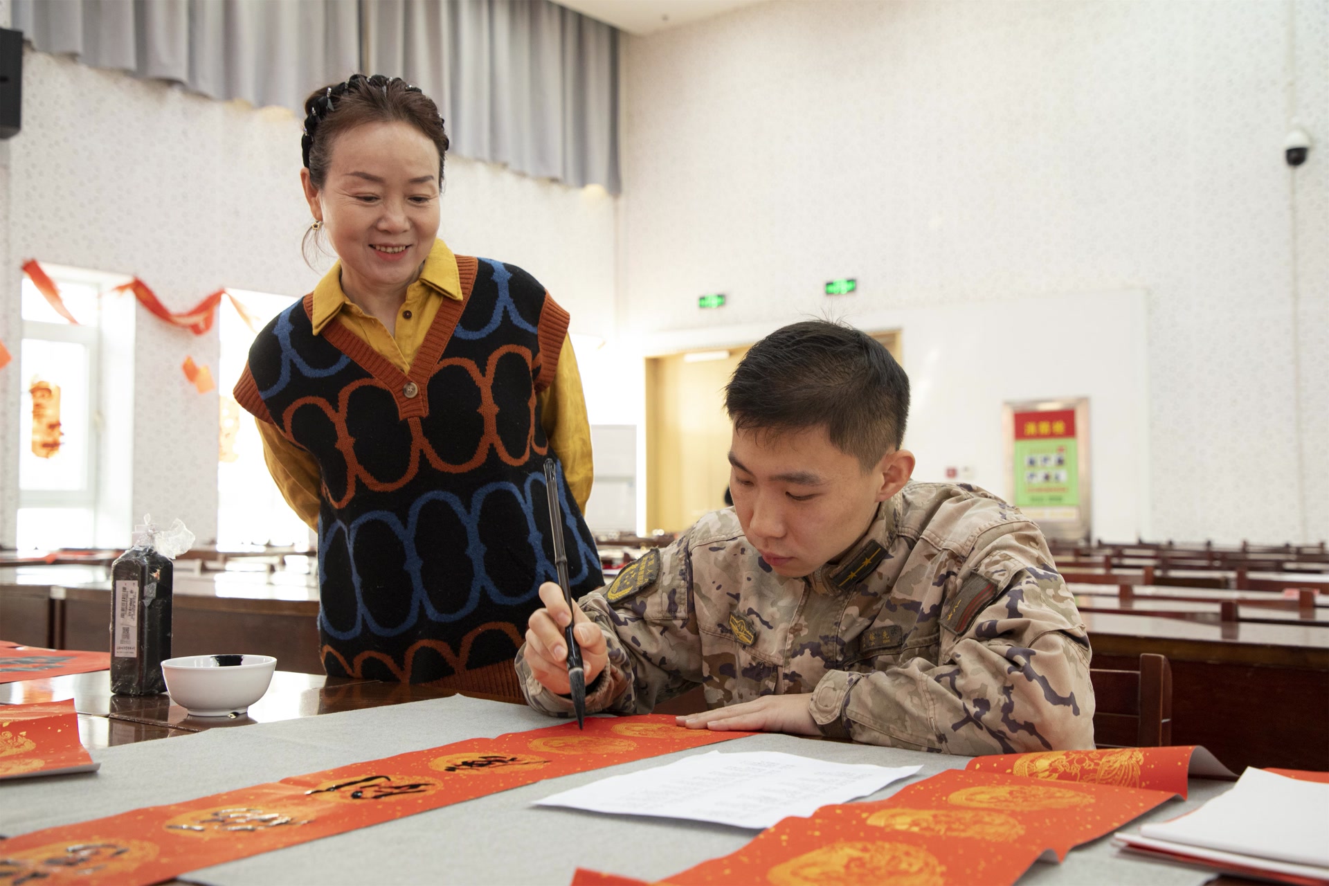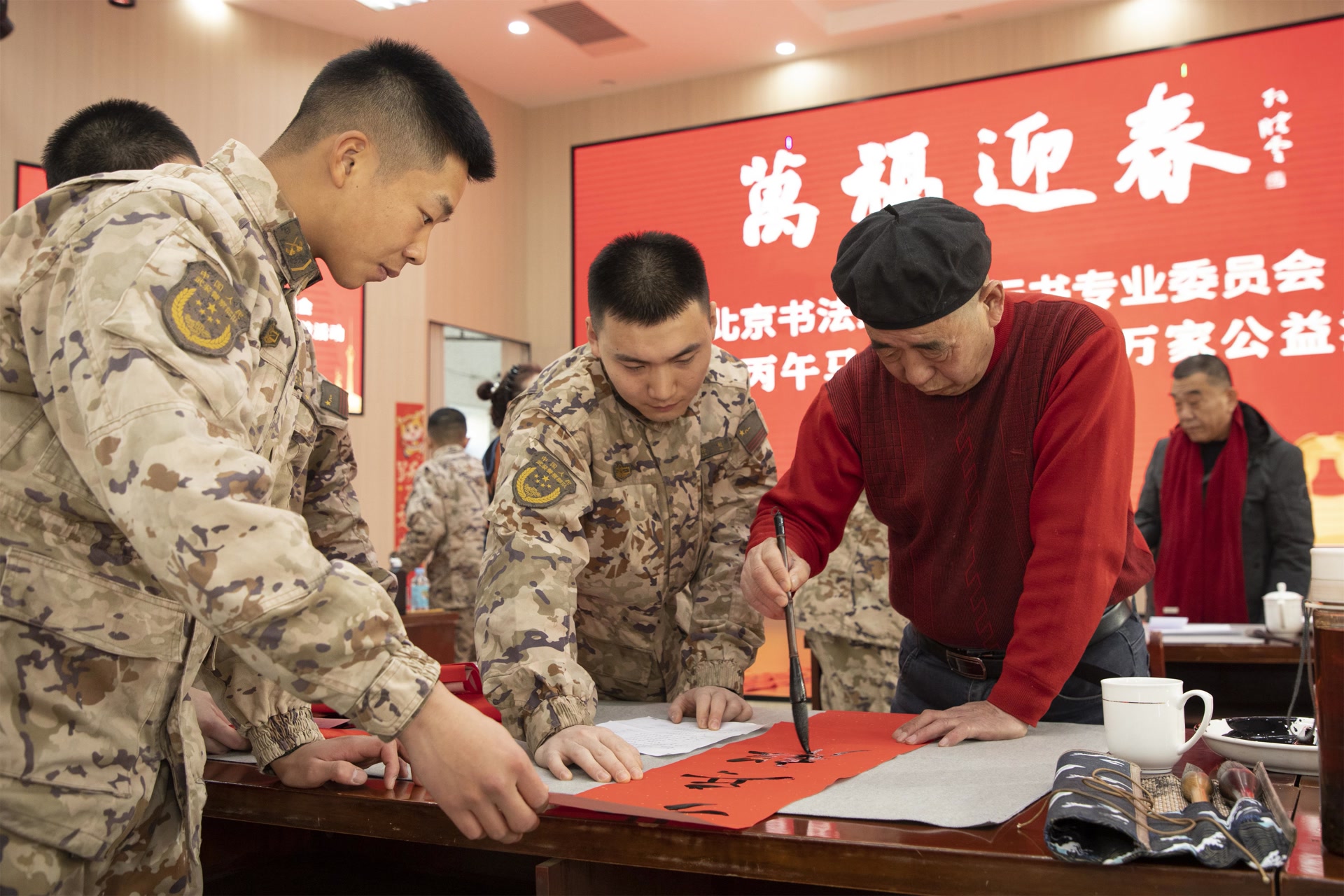 活动特设“笔墨竞锋”环节,战士代表与书法老师同台书写“胜”“战”“勇”等关键字,一笔一画,力透纸背。现场金句频出:“笔下有千钧,肩上是山河”“这‘福’字,要写出保家卫国的厚重感”。