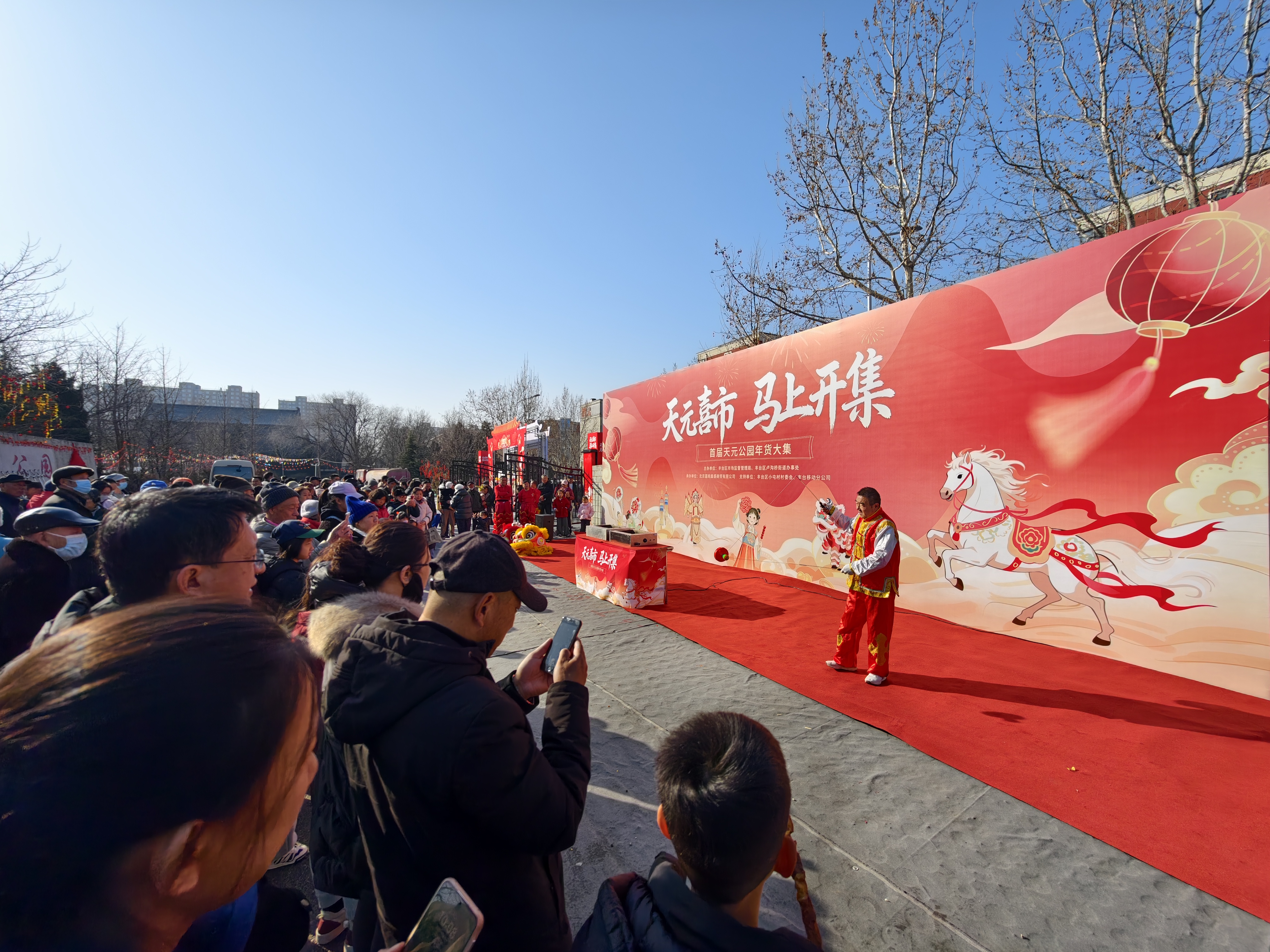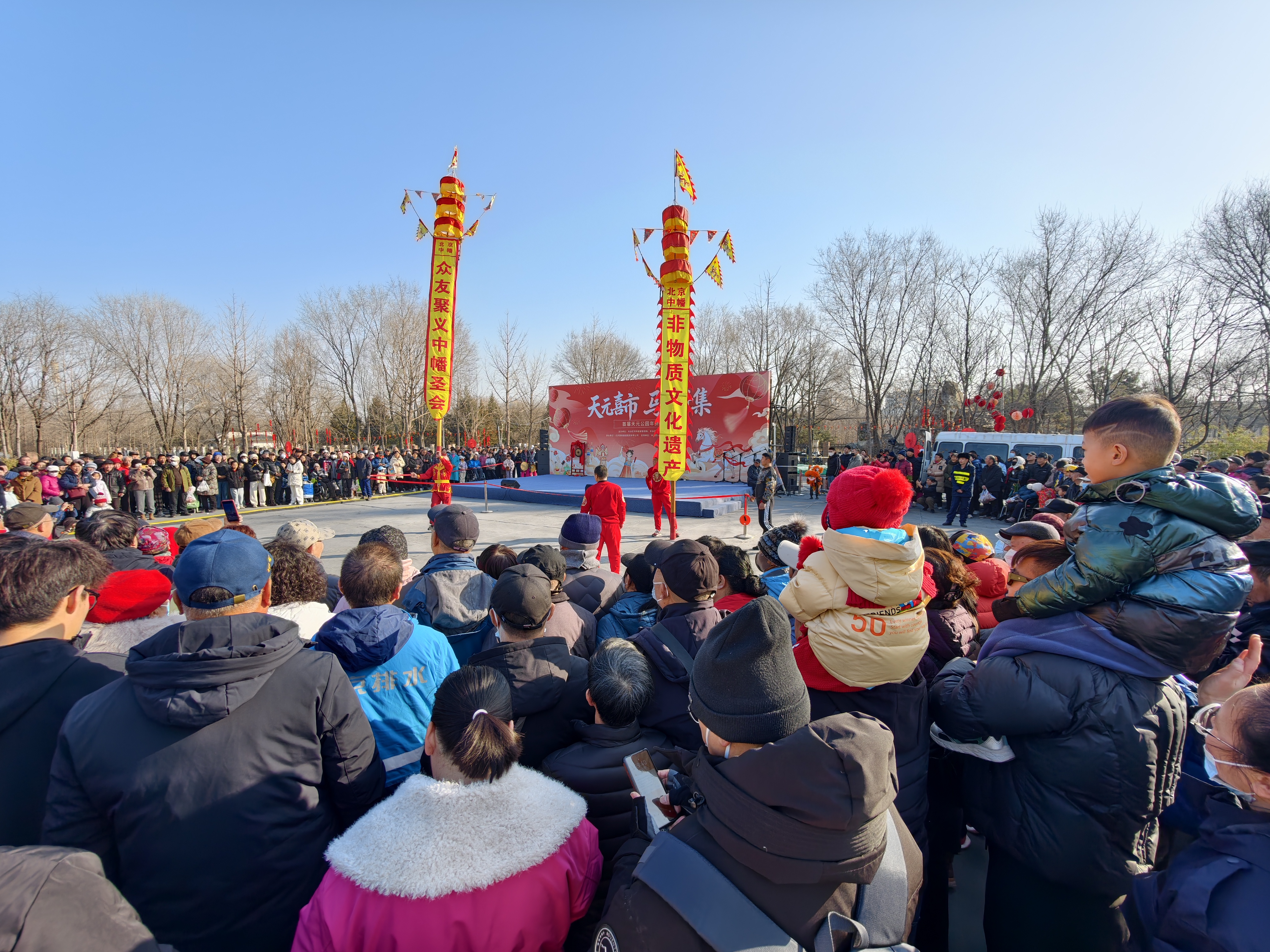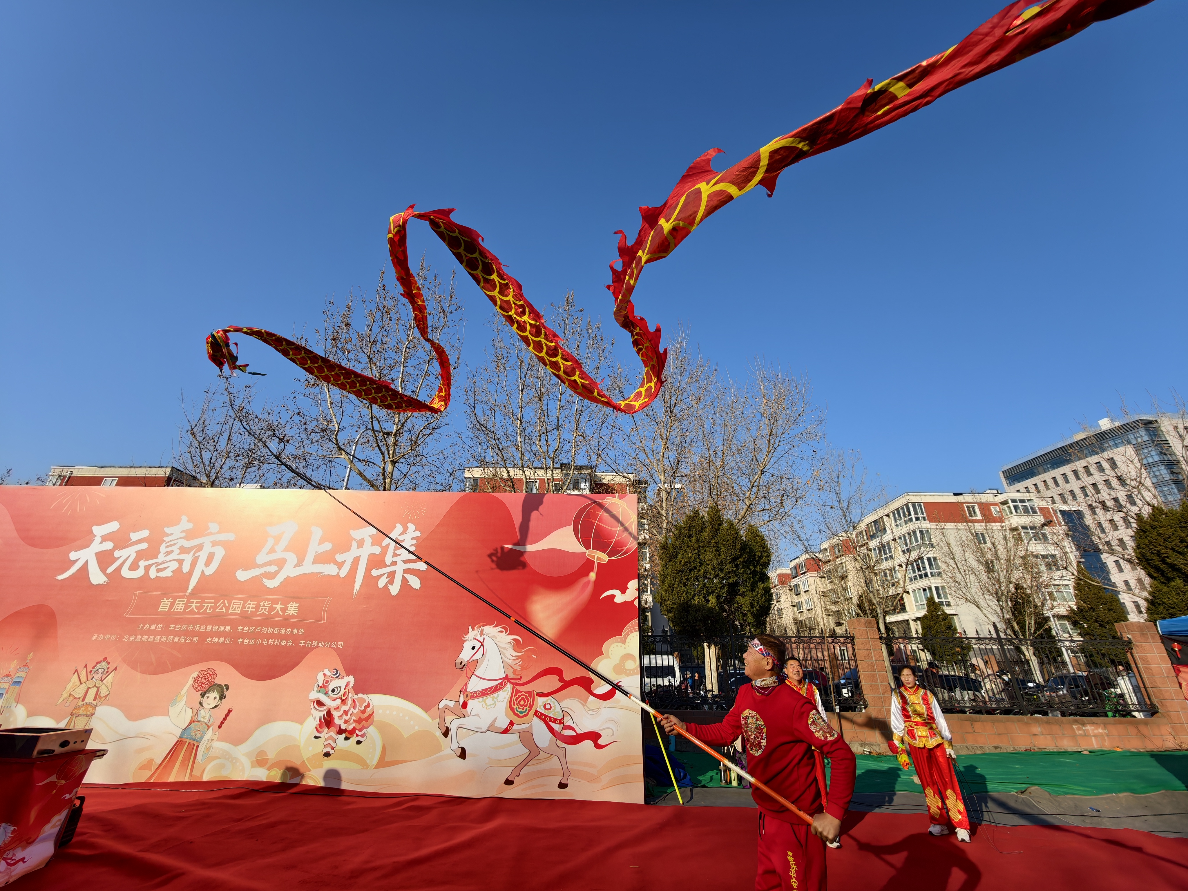 上午十时许,大集中央广场被围得水泄不通。里三层外三层的观众踮起脚尖,把孩子举过头顶——场地中央,丰台区级非遗项目中幡表演正在上演。