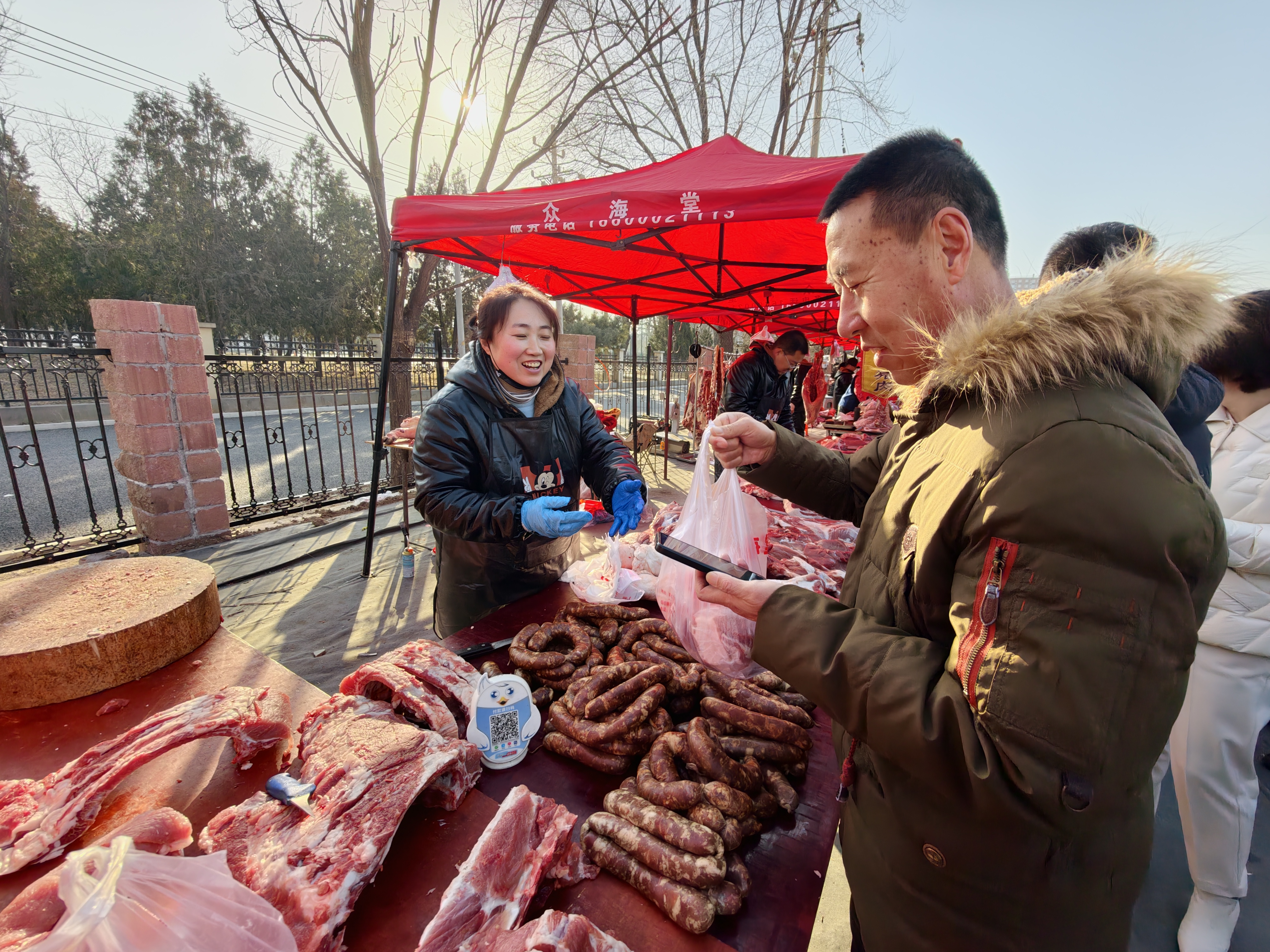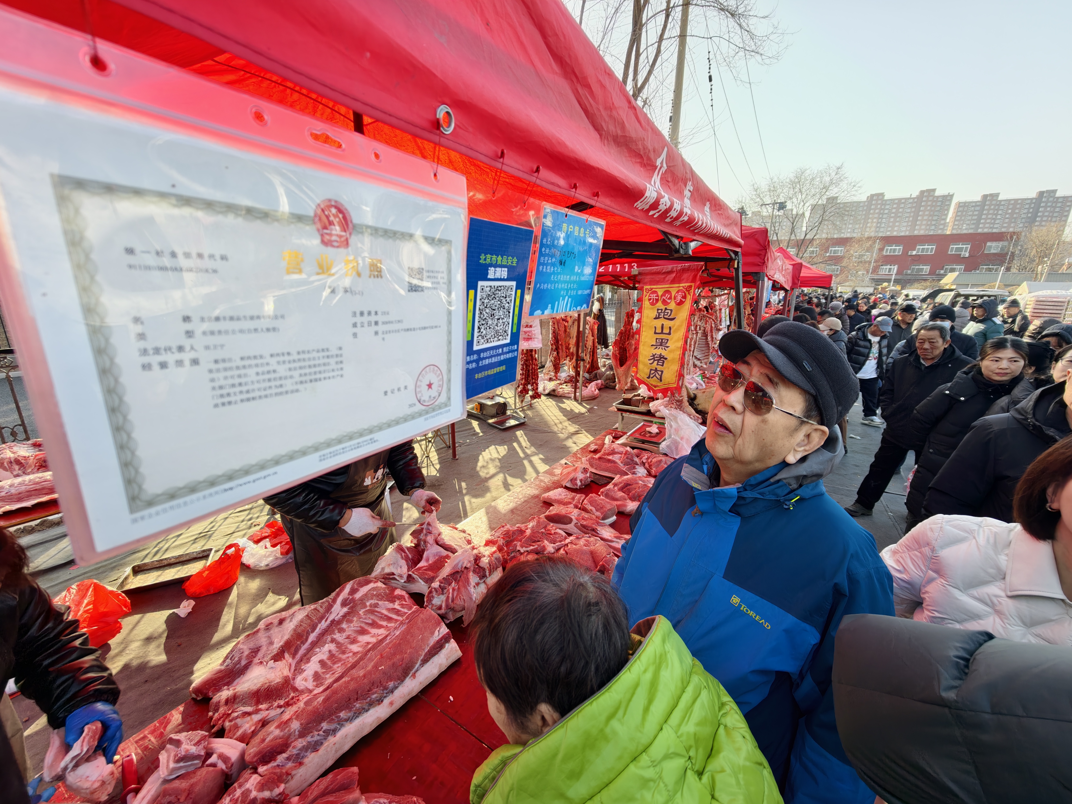 据丰台区市场监督管理局现场执法人员介绍,这是北京市食品安全追溯体系首次在室外新春大集中规模化应用。天元大集作为今年丰台首个大型户外年货市集,实现了进场肉品商户“应贴尽贴”。消费者扫码即可实时查验检疫证明、进货渠道、检验结果,“来源可追、群众可查”从批发市场的规范变成露天大集的标配。